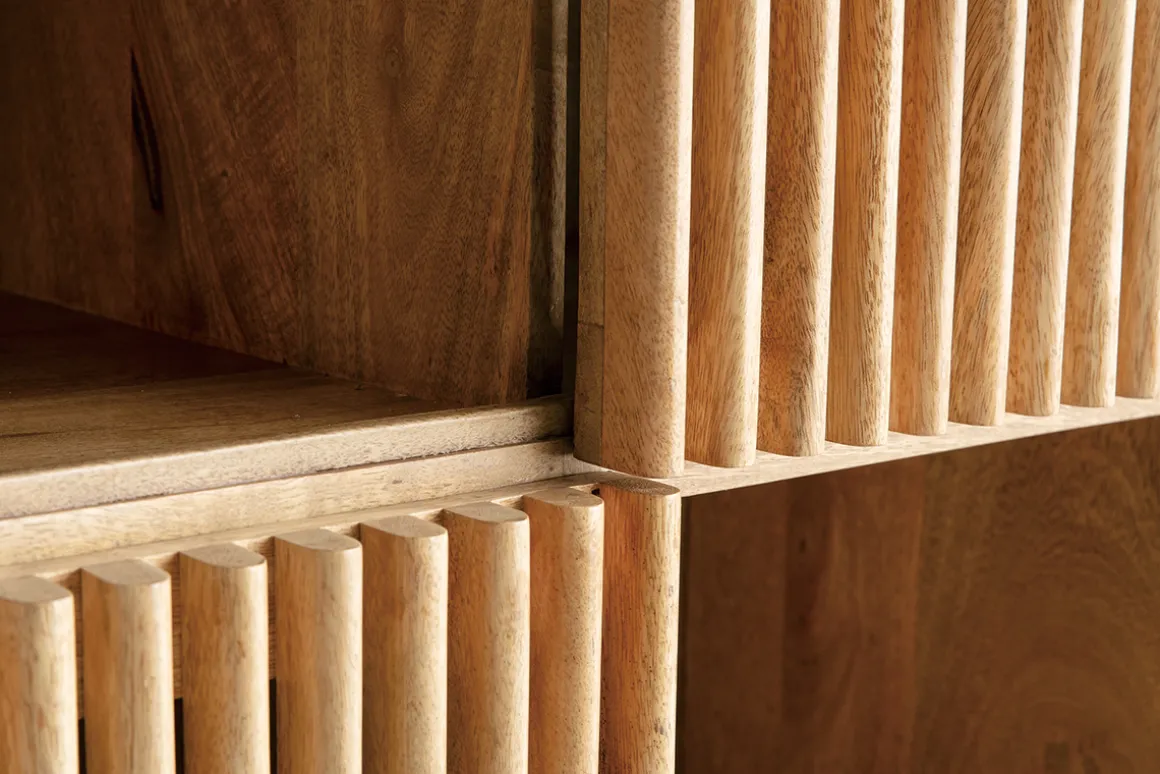 Sa structure est réalisée intégralement en bois massif selon des techniques artisanales. L’utilisation du manguier associé au « fait main » donne à ce meuble un aspect unique et chaleureux. Pour apporter de la légèreté à ce meuble en bois, un piètement haut et fin a été ajouté et les rangements ont été fermés par des portes ajourées. Les barreaux créent un effet graphique original.