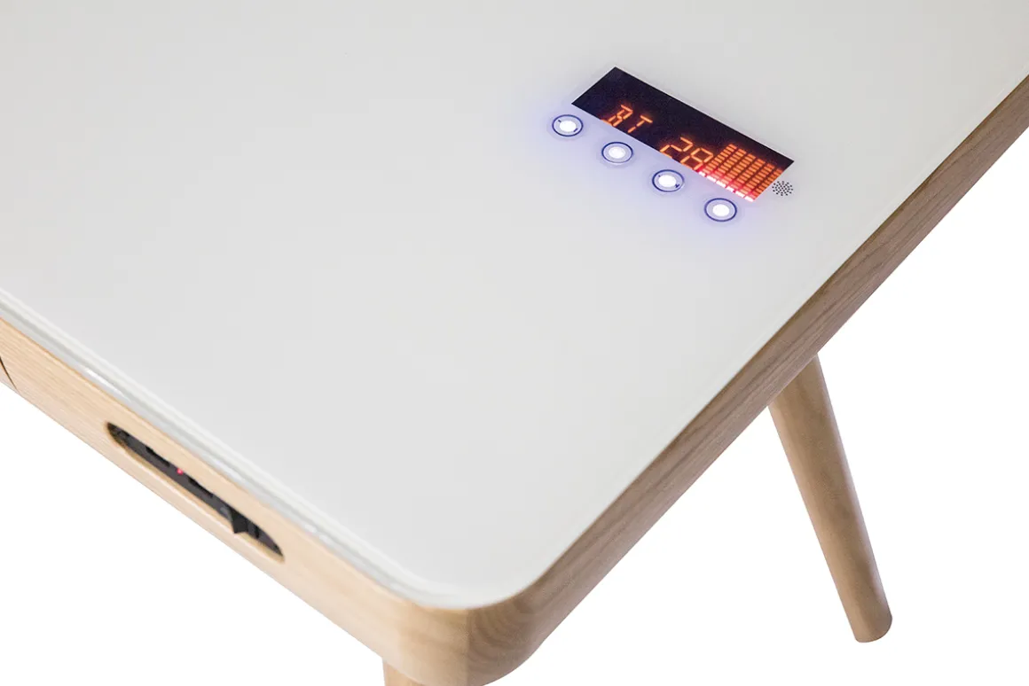 De plus, des enceintes sont intégrées au bureau. Le son est d’une qualité excellente et vous vous pouvez régler le volume, changer de chanson, mettre la piste en pause depuis l’interface tactile intégré au plateau. L’enceinte est accessible par bluetooth afin de pouvoir envoyer de l’audio directement depuis une tablette, un ordinateur ou un smartphone.