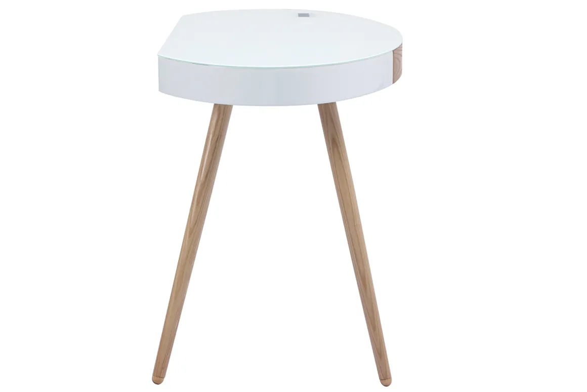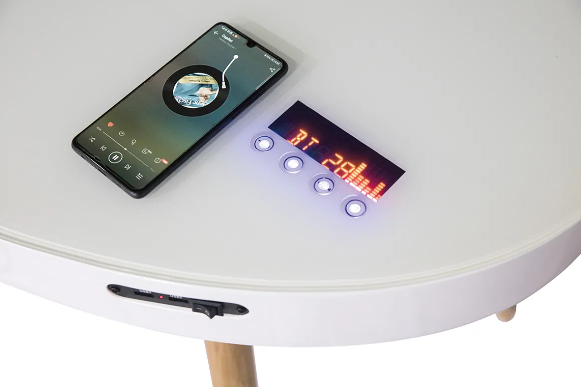 Ce bureau blanc et bois clair dispose de deux prises USB, grâce auxquelles vous pourrez recharger vos différents appareils. Ce bureau équipé du bluetooth permet d’envoyer de l’audio depuis tablette, ordinateur ou smartphone. Les enceintes intégrées, avec volume réglable diffusent un son d’une belle clarté, au-delà de ce que propose un ordinateur en termes de qualité sonore. L’interface tactile, directement insérée sur le plateau du bureau, vous permettra ainsi d‘augmenter ou baisser le volume, passer à la chanson suivante ou mettre en pause la lecture d’une piste.
