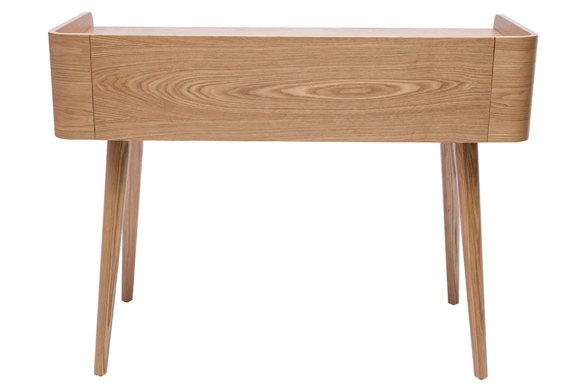 Grâce à ses pieds en bois massif légèrement inclinés, ce bureau arbore un style résolument contemporain, tout en restant stable et robuste. Il offre une surface de travail suffisante pour accueillir un ordinateur portable, des documents et d’autres essentiels de bureau, tout en restant visuellement léger et élégant.