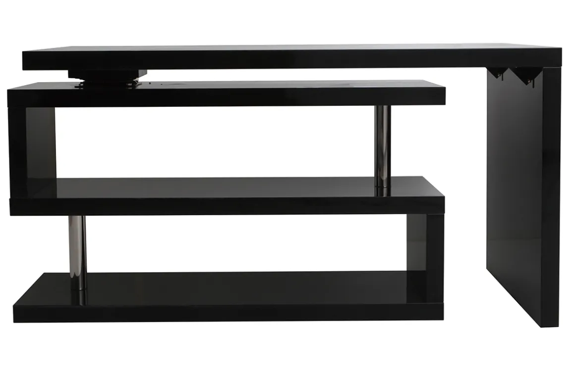 Ce bureau design à la finition laquée vous surprendra grâce à ses formes contemporaines associées à un système d’étagères rotatif pour un espace de travail 100% modulable.