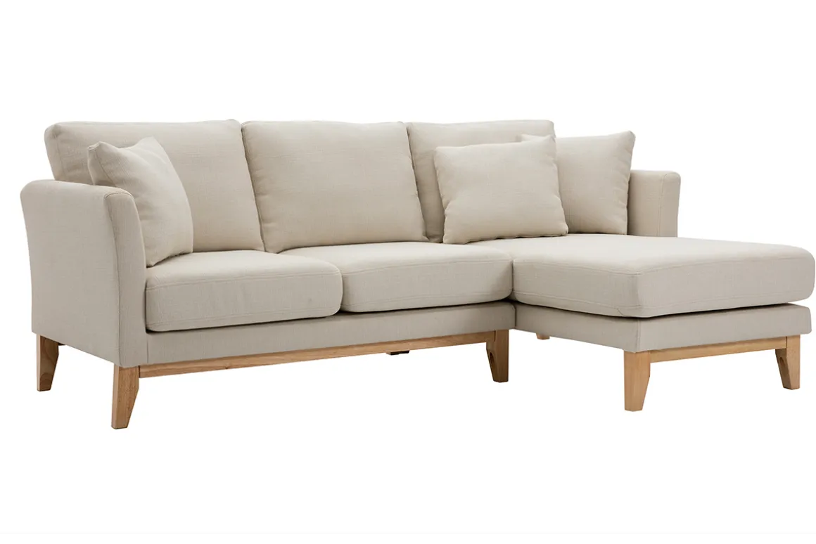 Canapé d’angle droit déhoussable scandinave en tissu beige et bois clair 4 places OSLO livré prêt à assembler. Montage simple, seuls les pieds sont à fixer. Les colis étant volumineux, nous vous conseillons de vérifier que portes et escaliers permettent leur passage.