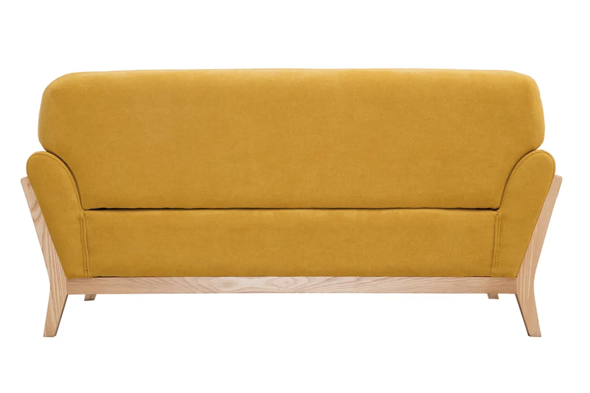 Le mariage entre une assise généreuse, habillée d’une trame 100% polyester – aussi agréable à l’oeil qu’au toucher – et une structure apparente en bois massif (frêne massif), fait tout le charme de ce canapé en tissu effet velours jaune moutarde et bois clair.