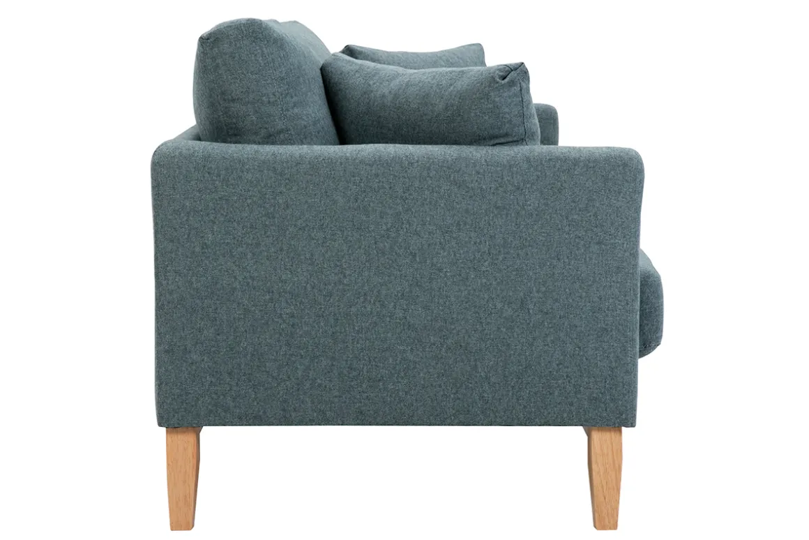 Formant un duo sans fausse note, le revêtement en tissu (100% polyester) et le piètement en hévéa massif, subliment avec simplicité les lignes de cet élégant canapé vert de gris.