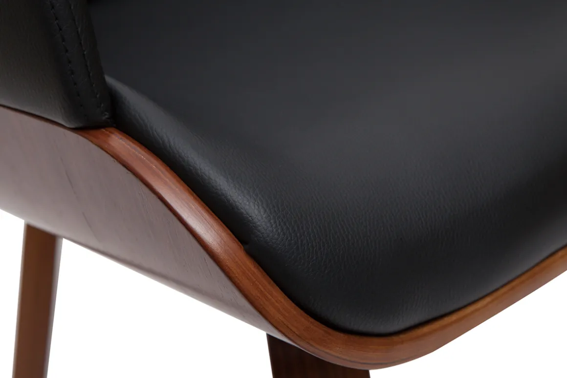 Parfait mélange entre polyuréthane noir et bois foncé, cette chaise dans l’air du temps ne manquera pas de sublimer votre salle à manger. Joli dossier matelassé et silhouette moderne façonnent cette chaise en pièce de mobilier hyper branchée ! Cette chaise avec accoudoirs au faux airs de fauteuil sera l’élément clé pour apporter une belle touche d’élégance et de chaleur dans la pièce.