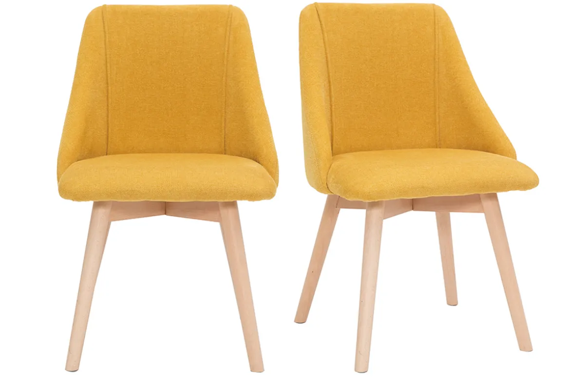 Chaises scandinaves en tissu effet velours texturé jaune moutarde et bois clair HIGGINS vendues par lot de 2. Livrées prêtes à assembler. Montage simple, seuls les pieds sont à fixer.