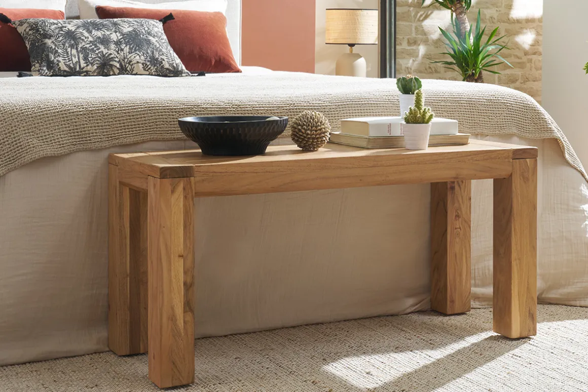 Ce banc d’intérieur met à l’honneur l’acacia massif avec splendeur. Essence de bois exotique aux reflets dorés, il laisse apparaître ici ses nervures et ses noeuds tout en beauté. Cette matière naturelle est mise en valeur par un design brut, venant souliger le caractère authentique de ce banc. Plébiscitée pour la confection de mobilier d’intérieur, l’acacia est une essence naturellement dure et dense particulièrement esthétique. Ce bois imputrescible, se distingue par ses veinures allongées, mais également ses variations de couleurs. Avec le temps, l’exposition à la lumière et sources de chaleur, l’acacia est un bois clair dont le coloris jaune-vert à doré subit une coloration naturelle (brune, rougeoyante, reflets gris). Ce meuble en bois d’acacia est traité avec une finition laque incolore.