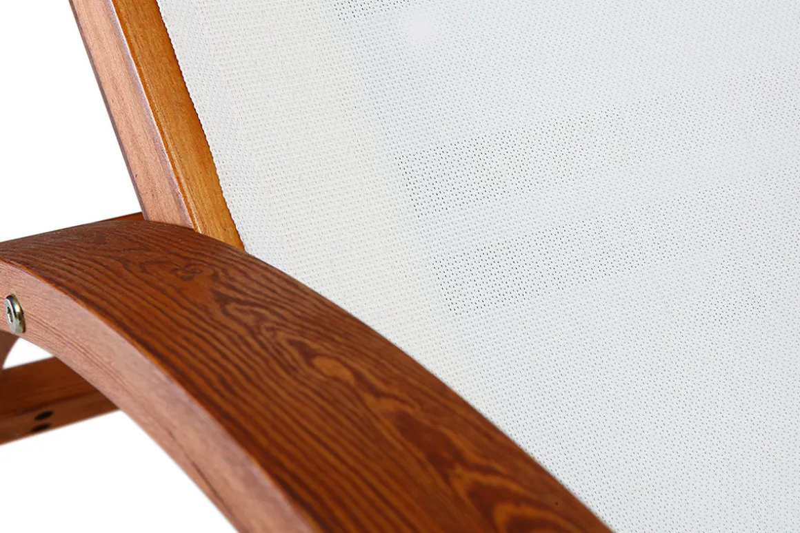 La structure en mélèze de ce bain de soleil blanc est un bois imputrescible. La toile blanche est en textilène, un mélange de polyester recouvert de PVC.