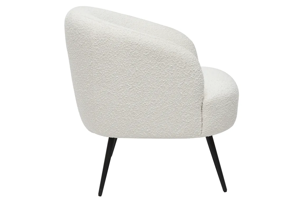Ce fauteuil design blanc cassé est recouvert d’un superbe tissu effet laine bouclée (100% polyester) à la texture duveteuse et réconfortante. Sa généreuse assise (épaisseur 21 cm) combine des ressorts et 2 épaisseurs de mousse pour toujours plus de confort (densités 25 kg/m3 et 24 kg/m3).