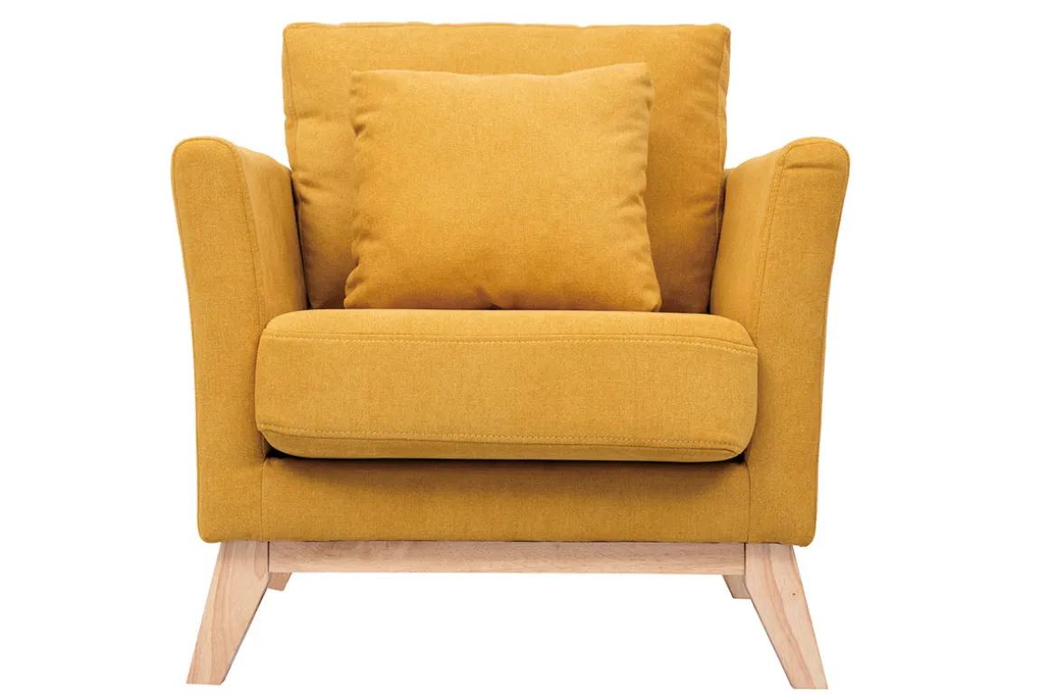 Fauteuil scandinave déhoussable en tissu effet velours jaune moutarde et bois clair OSLO, livré prêt à assembler. Montage simple, seul le piètement est à fixer.