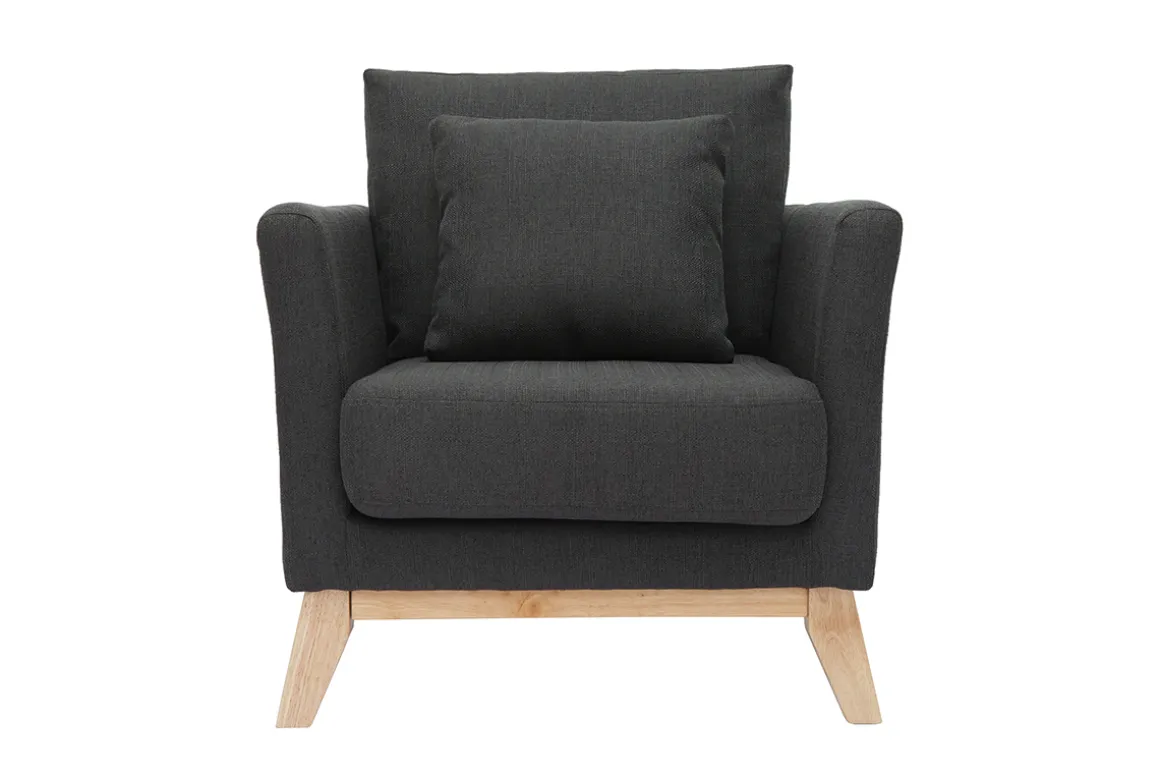 Fauteuil scandinave déhoussable en tissu gris foncé et bois clair OSLO, livré prêt à assembler. Montage simple, seul le piètement est à fixer.