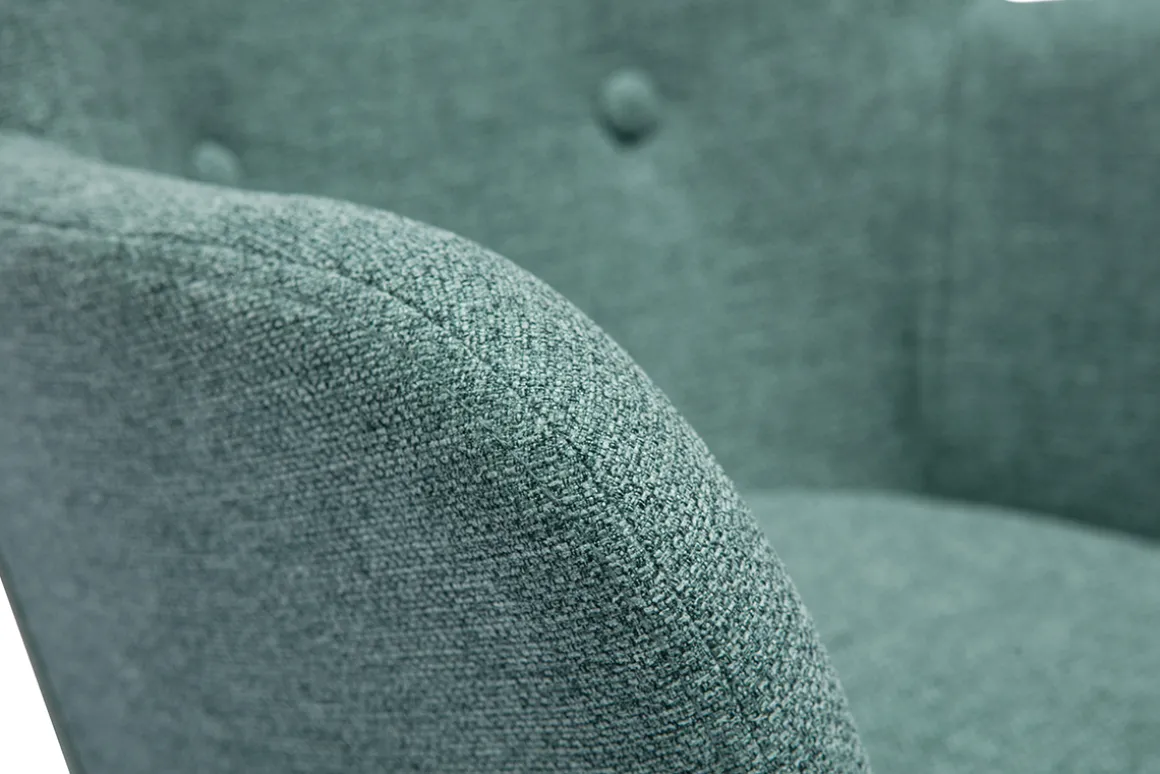 Fauteuil scandinave en tissu vert de gris livré prêt à monter. Seuls les pieds sont à fixer.