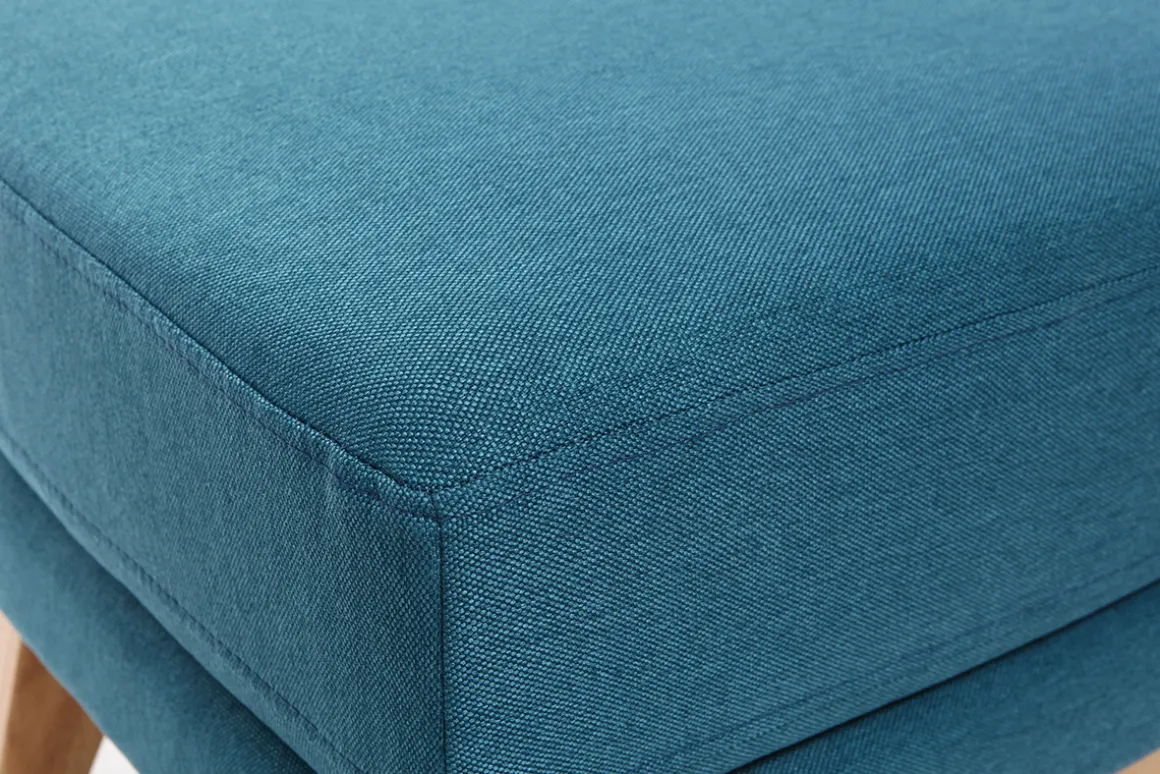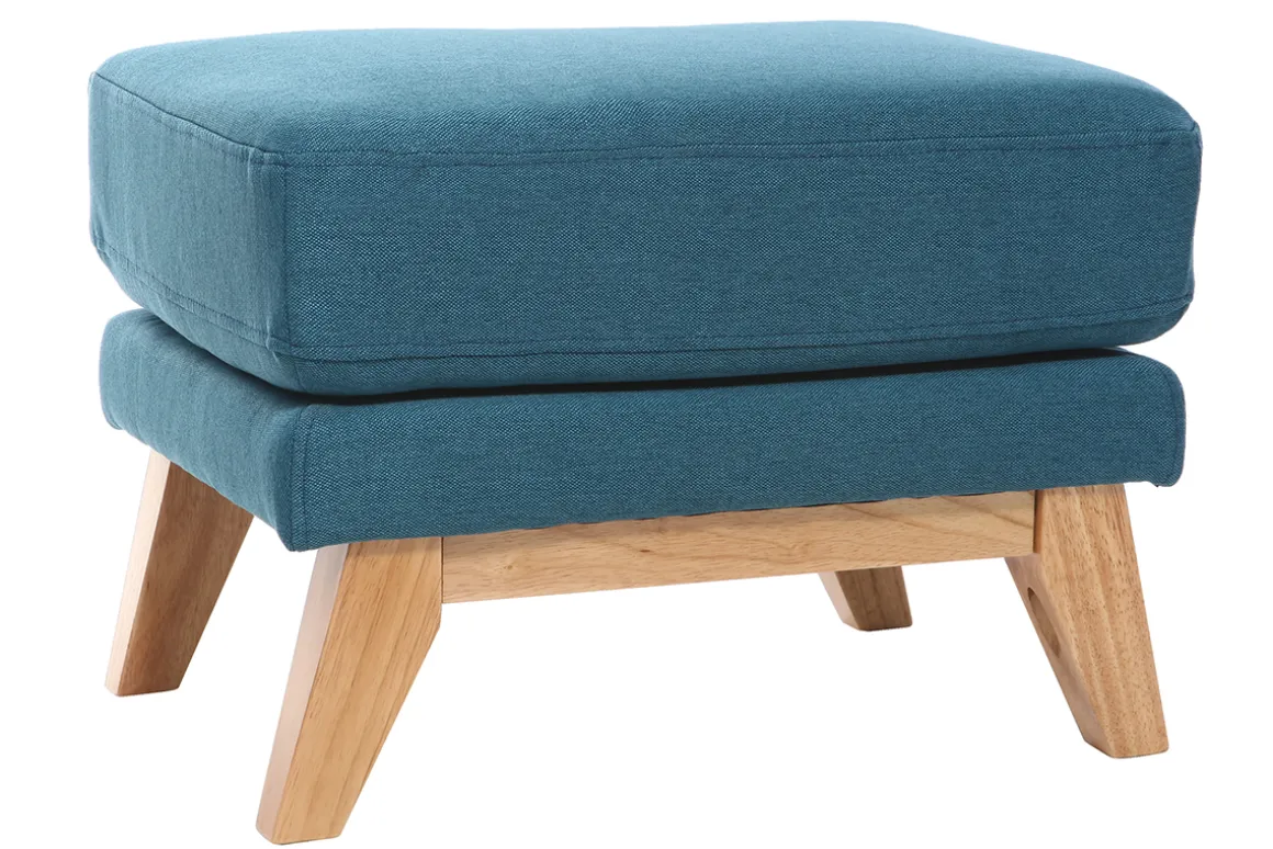 Pouf repose-pieds déhoussable scandinave en tissu bleu canard et bois clair OSLO livré à assembler. Montage simple, seuls les pieds sont à fixer.