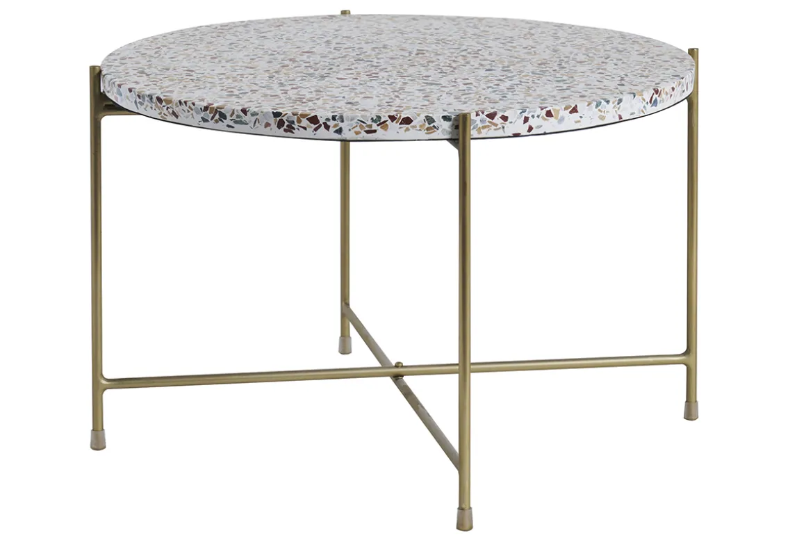 Cette table basse originale et lumineuse est fabriquée à partir de Terrazzo, un matériau minéral composé d’éclats de pierres et de ciment. Très prisé des architectes d’intérieur, ce matériau résistant se distingue par ses motifs mouchetés volontairement irréguliers.