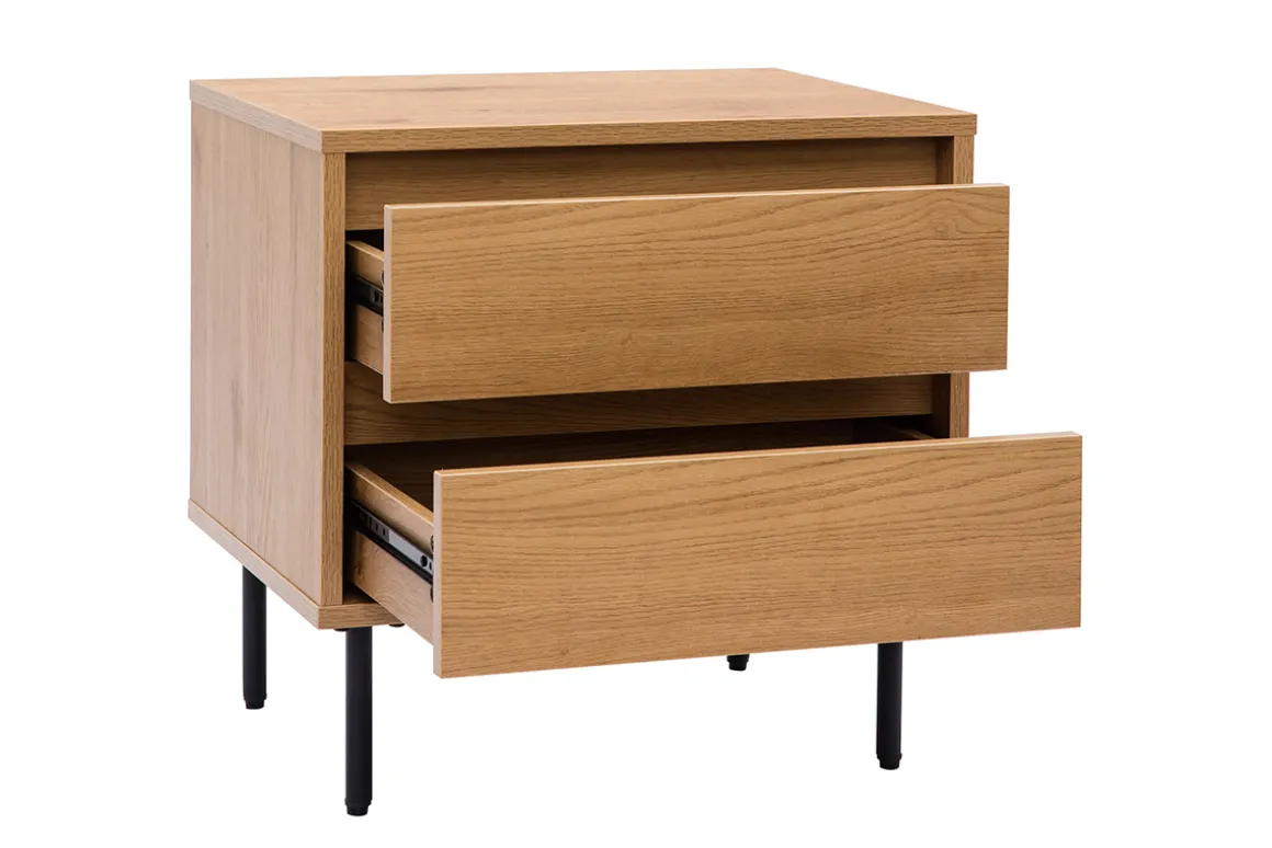 Avec ARAGON, bois et métal prouvent une fois de plus qu’ils forment le tandem parfait. Composée d’un caisson en mélamine à l’effet chêne nervuré et d’un piètement métallique noir, la table de chevet ARAGON n’est pas sans rappeler les pièces de mobilier à l’esprit industriel. Ce joli mariage de matières est mis en valeur par une silhouette épurée aux lignes nettes. Chaleureuse sans être dépourvue de modernité, cette table de nuit à tiroirs permettra de composer une chambre très cosy !