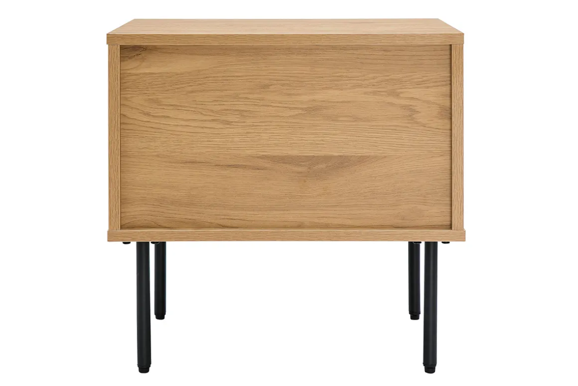 Avec ses dimensions parfaites (L50 x P42 x H50 cm), la table de chevet PERNELLE investit les petits espaces comme les plus grands. Ses lignes sobres et intemporelles et son piètement ultra fin en métal noir (H20 cm) permettent de ne pas surcharger visuellement l’espace. Le caisson en panneaux de particules finition chêne (mélamine) arbore de jolies nuances dorées ainsi que des veines marquées. On aime cette association entre le caractère authentique du bois et le langage contemporain du métal.