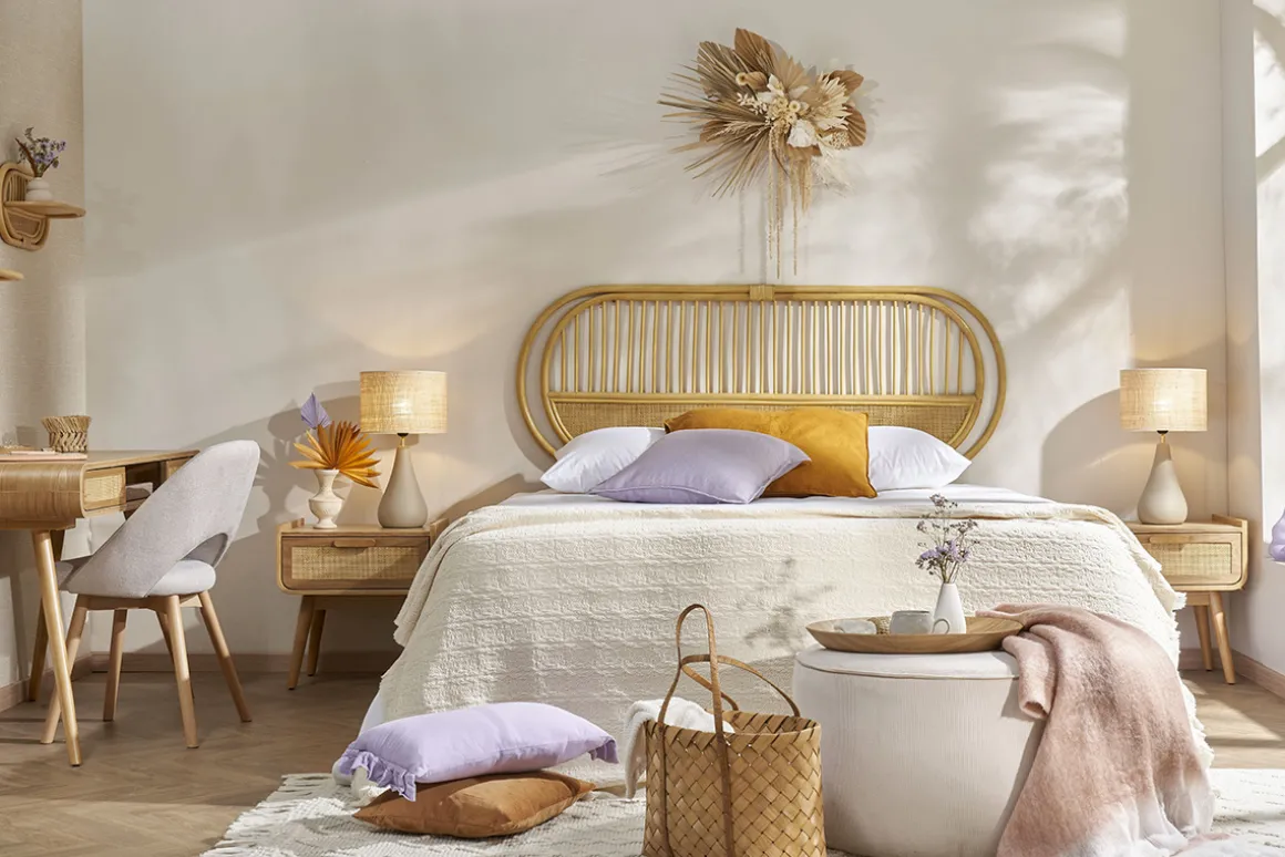 Envolée poétique. Pour parfaire la scène déco de votre douillet cocon, on imagine ATHÈNE former un duo épuré avec une tête de lit déco en rotin. Parfait pour donner un bel effet accrocheur à la chambre à coucher !