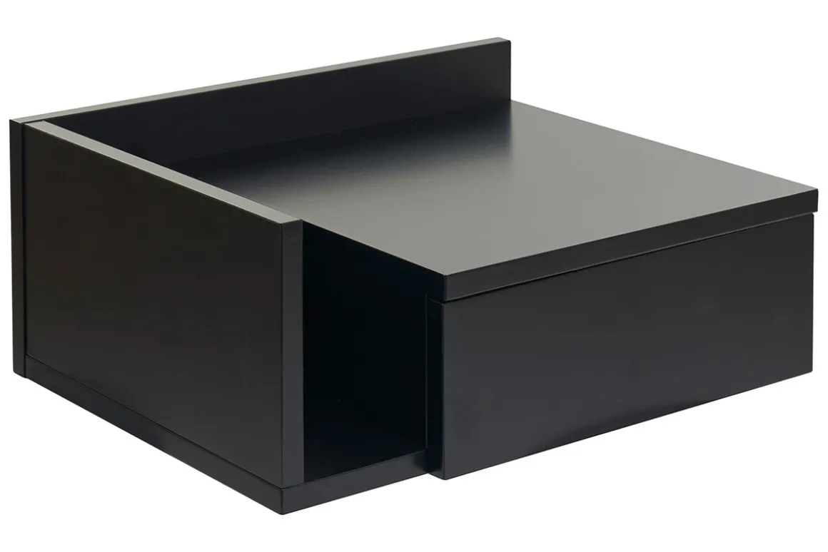 Conçue en deux parties, cette table de chevet à suspendre noire (dimensions L40 x P32 x H16.5 cm) se compose d’un tiroir (L21.5 x P23.5 x H5.5 cm) et d’une niche ouverte (L8.5 xP28.5 x H10.5-15 cm). Parfait pour garder à portée de main une lecture, des lunettes, un réveil et tous vos indispensables avant le coucher et au réveil !