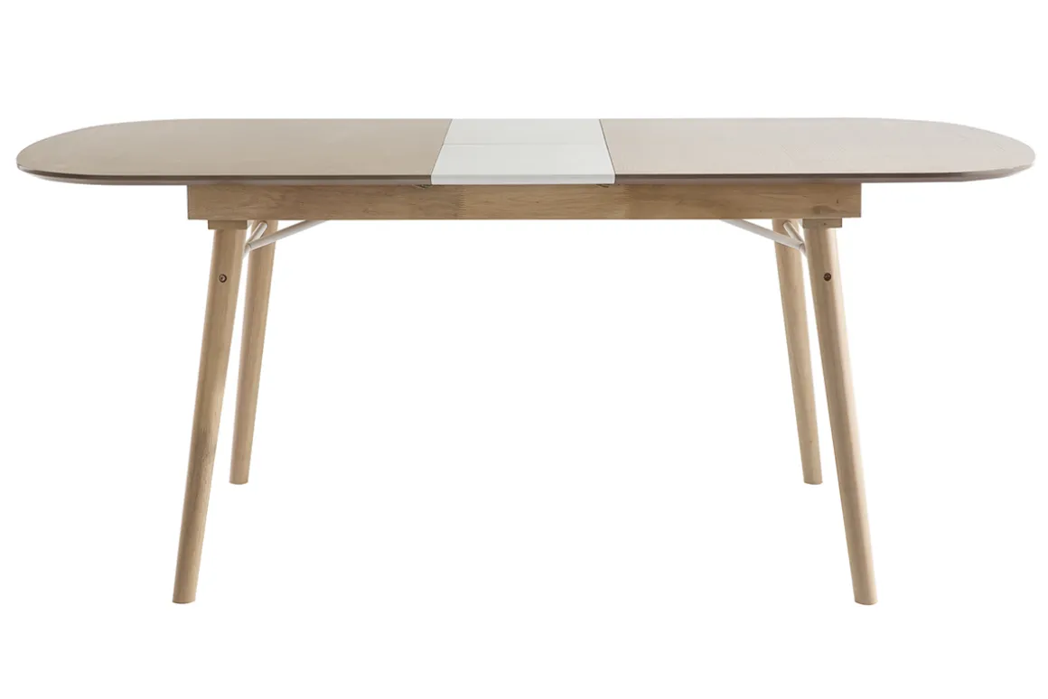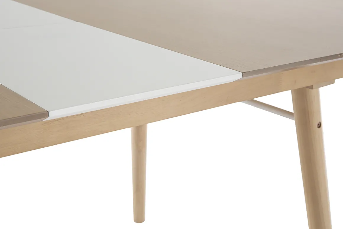 La table extensible Sheldon se compose d’un piètement en hévéa massif et d’un plateau en panneaux de fibres de bois finition chêne clair (épaisseur 1,8 cm) qui contraste à merveille avec la rallonge au fini blanc mat. Un renfort fin et discret en métal blanc vient compléter l’ensemble.
