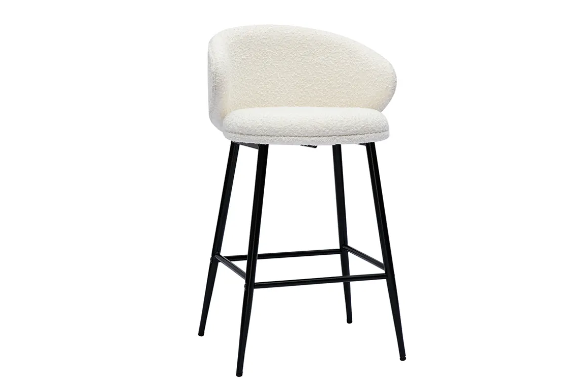 Ces tabourets blanc cassé sont recouverts d’un tissu effet laine bouclée (100% polyester) doux au toucher. L’élégant passepoil qui dessine les contours du dossier parfait l’ensemble.