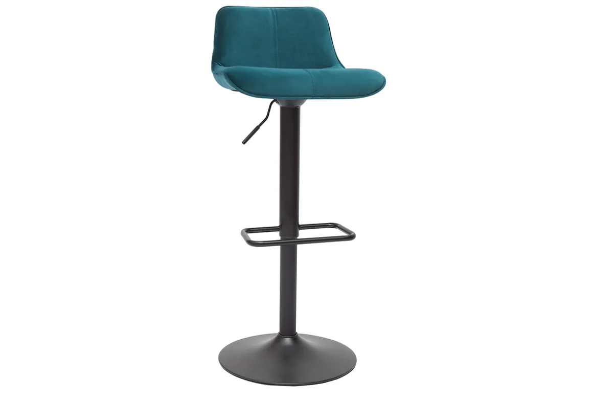 Tabourets de bar relevables en tissu velours bleu pétrole et métal noir vendus par lot de 2. Livrés prêts à monter.