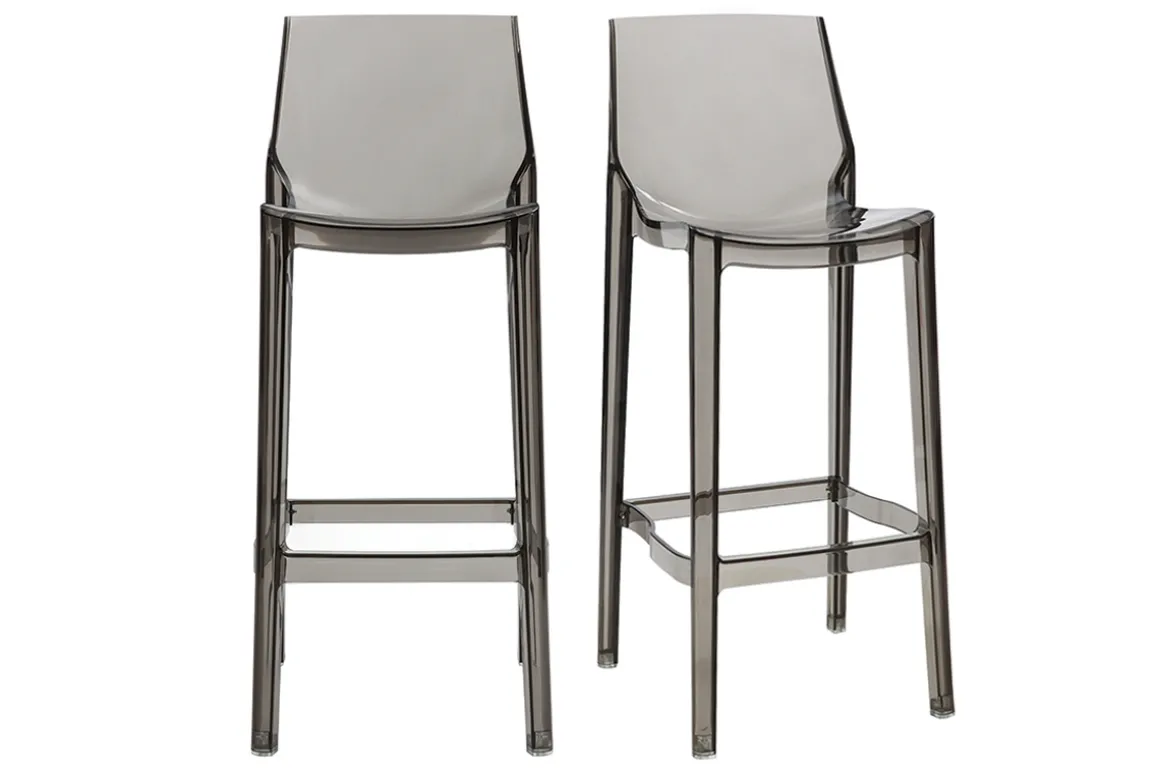 Fabriqués en polycarbonate, un matériau résistant aux UV et plébiscité pour sa robustesse, ces tabourets de bar transparents gris pourront aussi bien habiller votre intérieur que vos extérieurs. Apéritif estival autour d’une table haute sur une terrasse ensoleillé ou dîner animé autour d’une table de bar dans une salle à manger ? À mi-chemin entre originalité et simplicité, ces tabourets de bar design gris fumé s’accorderont parfaitement dans un intérieur contemporain.