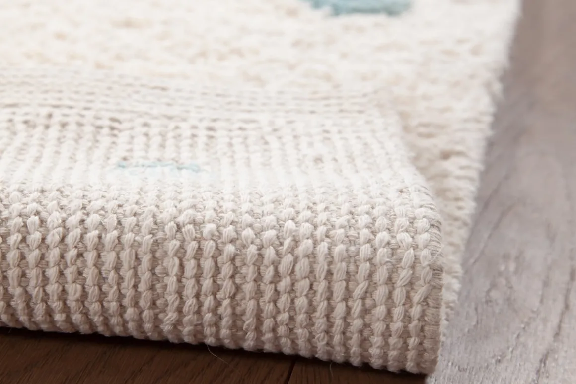 Confectionné selon la technique du tufté, ce tapis en fils de coton se démarque par son épaisseur et sa douceur naturelle. Ses dimensions (L150 x L100 cm) sont parfaitement adaptées aux petites chambres.