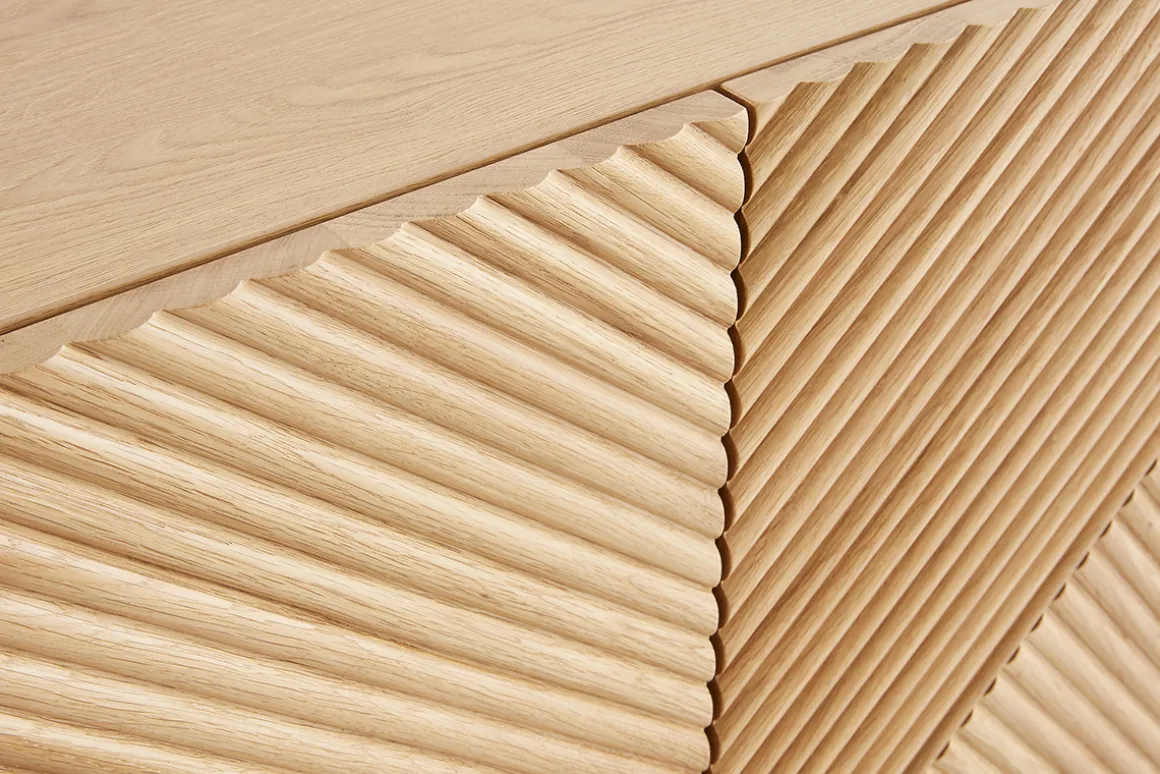 Ce meuble de rangement design fabriqué en Europe associe deux matériaux incontournables en matière de déco. Si le bois clair souffle le chaud grâce à son aspect authentique, le métal noir aime à jouer avec la légèreté des lignes et se distingue par la note de modernité qu’il sait apporter aux volumes. Harmonie des matières et originalité justement maîtrisée, ce buffet contemporain en bois clair et métal noir se démarque par sa façade habillée d’un jeu de gravures, rythmé ! Voilà un meuble en bois déco – aussi fonctionnel qu’esthétique – qui séduit par ses motifs, presque hypnotiques !
