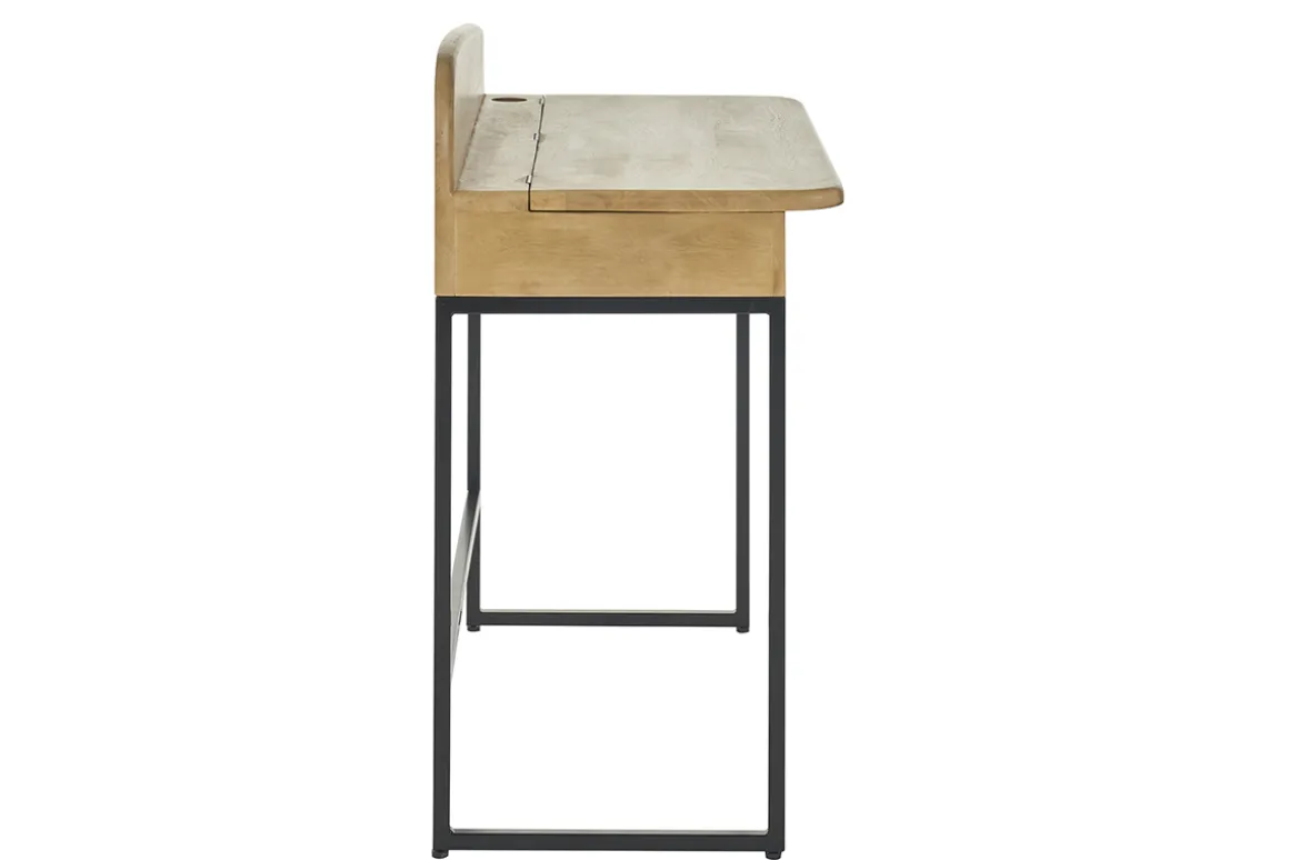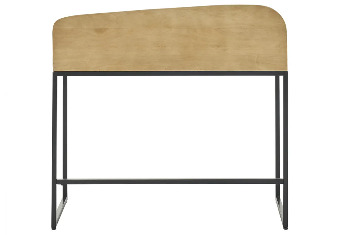 Avec un caisson en manguier massif et une structure en métal noir, ce bureau avec rangement sous plateau allie la douce blondeur d’une essence de bois exotique et le caractère intemporel d’un piètement moderne et aérien. Sans se contredire, rondeur et lignes droites se valorisent mutuellement. Tandis que l’un atténue la rigidité du matériau, l’autre valorise les courbes et la texture du bois. Voilà un bureau design en bois et métal qui se démarque par son style unique !
