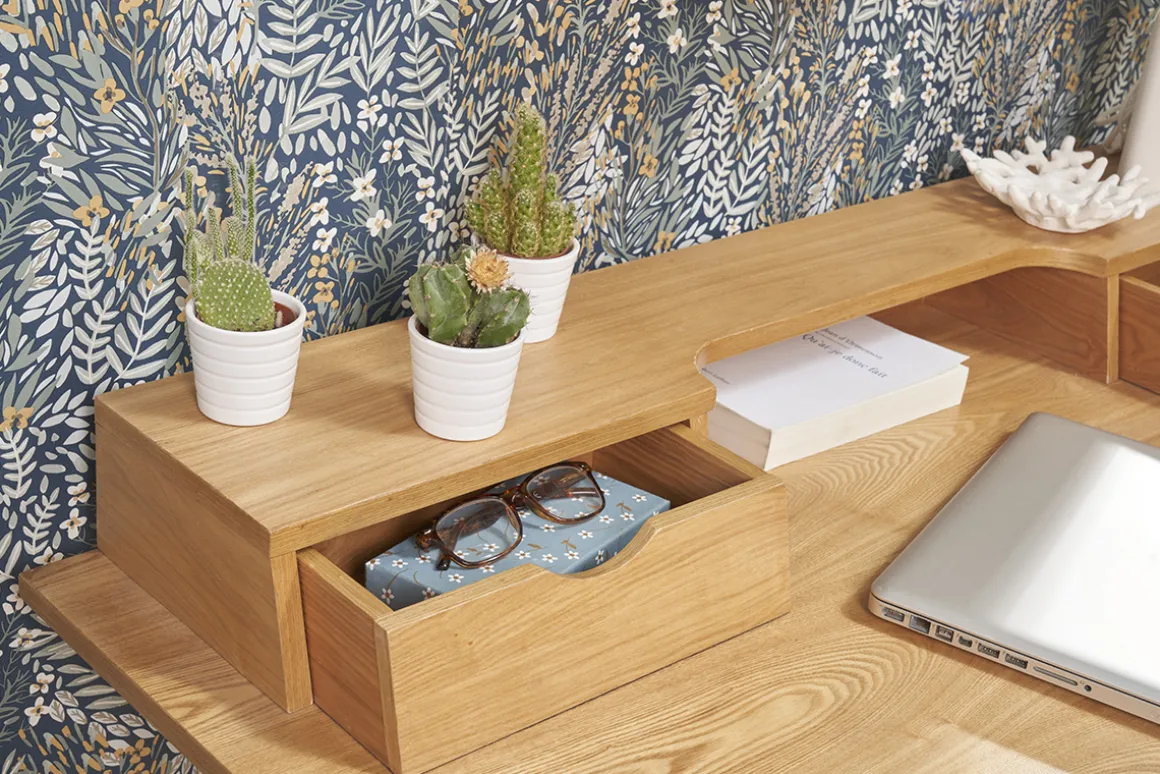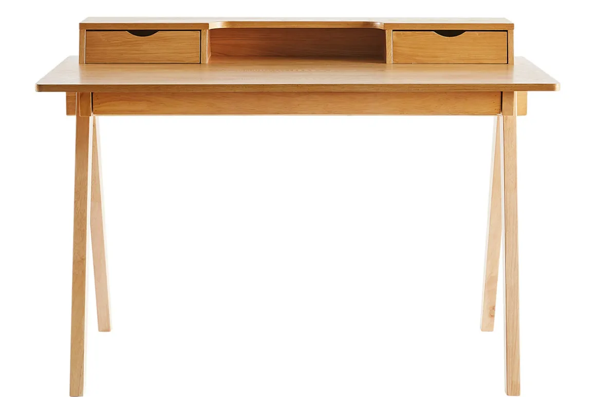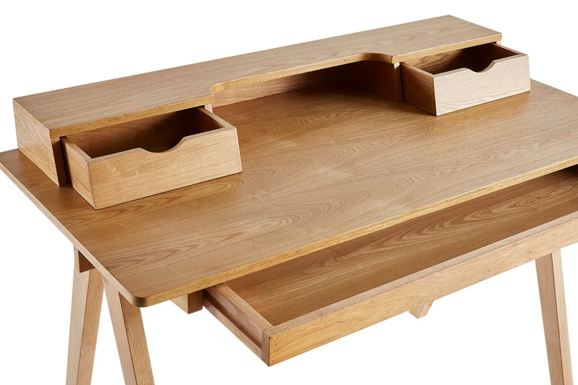Un « home-office » ordonné pour mieux se concentrer ! Composé d’un caisson en panneaux de fibres de bois placage frêne et soutenu par quatre solides pieds en hévéa massif, ce bureau robuste et facile à entretenir compte pas moins de deux tiroirs latéraux (L33 x P18 x H10 cm), une niche ouverte (L45.4 x P18 x H10 cm) et un large casier tiroir (L94 x P25 x H5.5 cm) sous plan de travail. Les compartiments bien pensés de ce bureau avec rangements intégrés vous permettront de classer du courrier, ranger votre papeterie et stocker vos documents en moins de temps qu’il en faut pour le dire. Le grand plateau accueillera quant à lui, une lecture, votre ordinateur portable, une tablette, une lampe à poser et tous vos effets utiles pour être plus productif ou inventif !