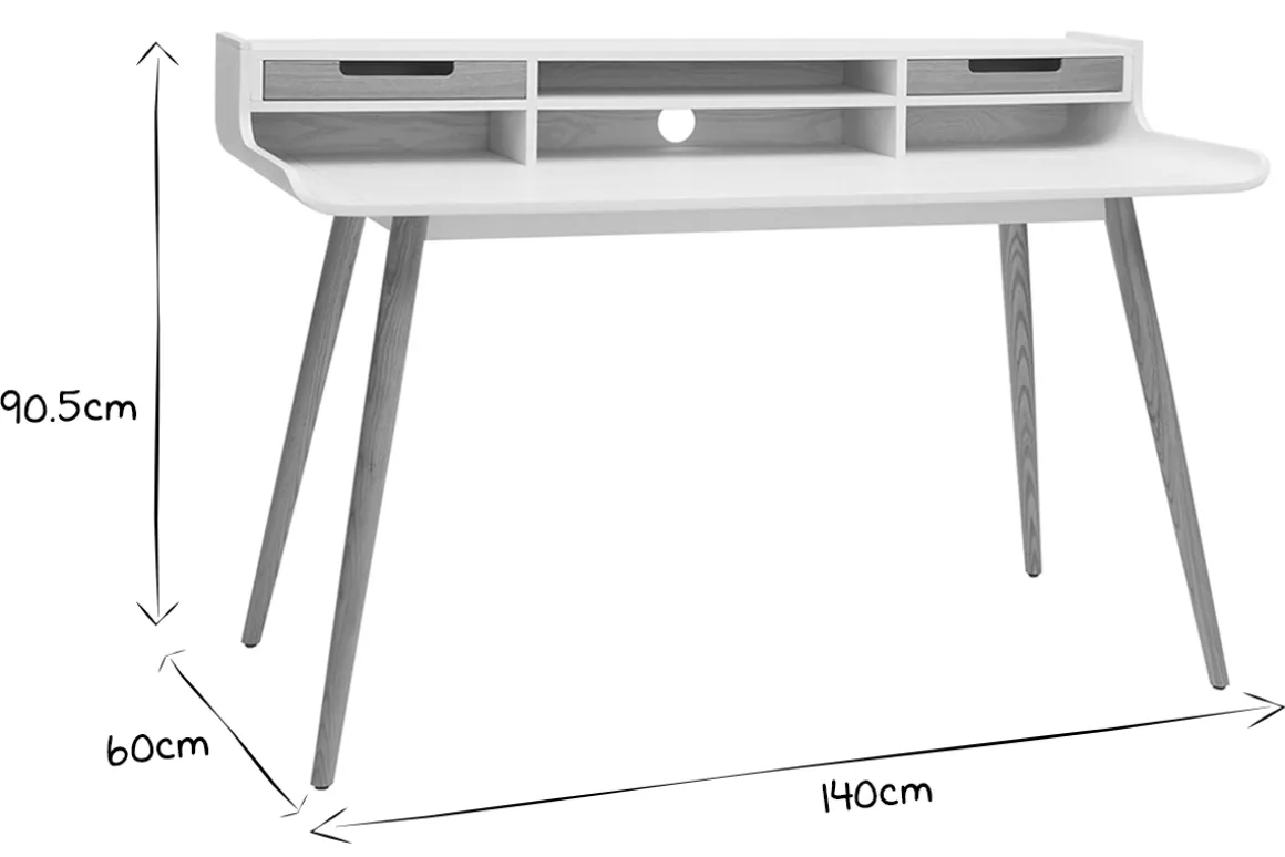 Ce bureau a la particularité d’offrir un bel espace de travail. Son grand plateau en contreplaqué (L140 x P38 cm) pourra facilement accueillir un ordinateur fixe, une lampe de bureau, des plantes ainsi que vos livres préférés. Ses six espaces de rangement, dont deux avec tiroirs, vous permettront de dissimuler les multiples objets qui envahissent l’espace de travail au fil du temps.