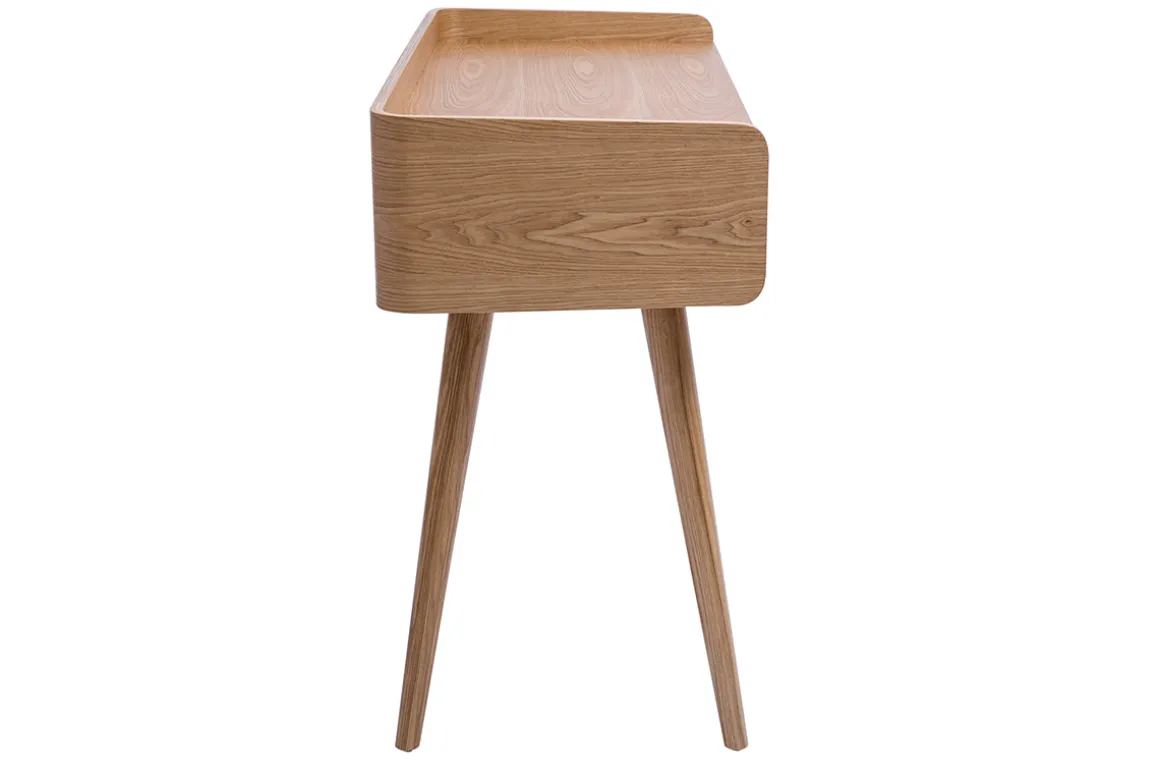 Grâce à ses pieds en bois massif légèrement inclinés, ce bureau arbore un style résolument contemporain, tout en restant stable et robuste. Il offre une surface de travail suffisante pour accueillir un ordinateur portable, des documents et d’autres essentiels de bureau, tout en restant visuellement léger et élégant.