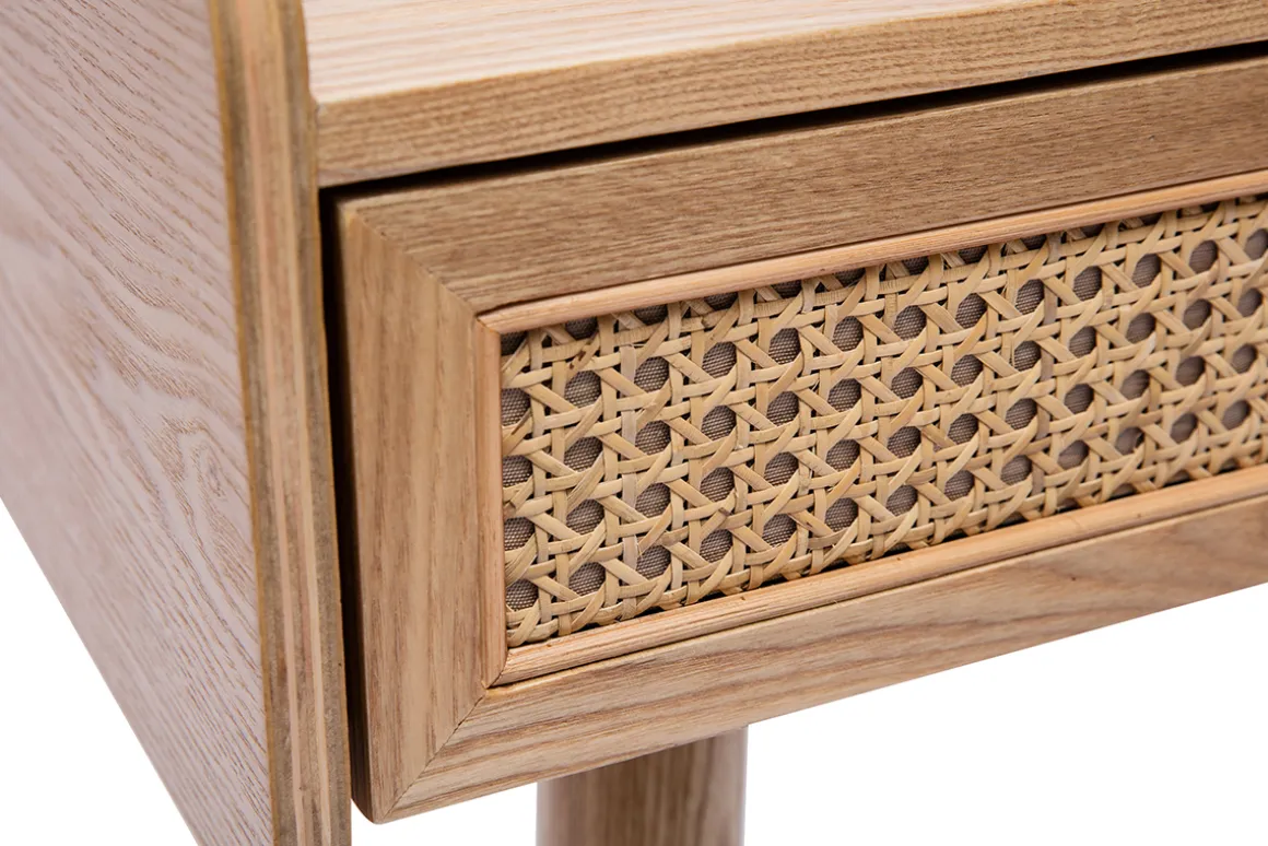 Le bois clair (plaquage d’eucalyptus), chaleureux et lumineux, s’associe parfaitement avec le cannage en rotin qui orne les deux tiroirs, ajoutant une texture naturelle et authentique à l’ensemble. Le design du bureau combine fonctionnalité et esthétique, avec ses deux tiroirs spacieux permettant de ranger vos fournitures de bureau et vos accessoires tout en gardant votre espace de travail organisé.