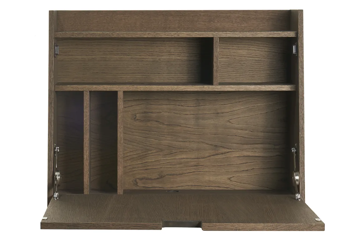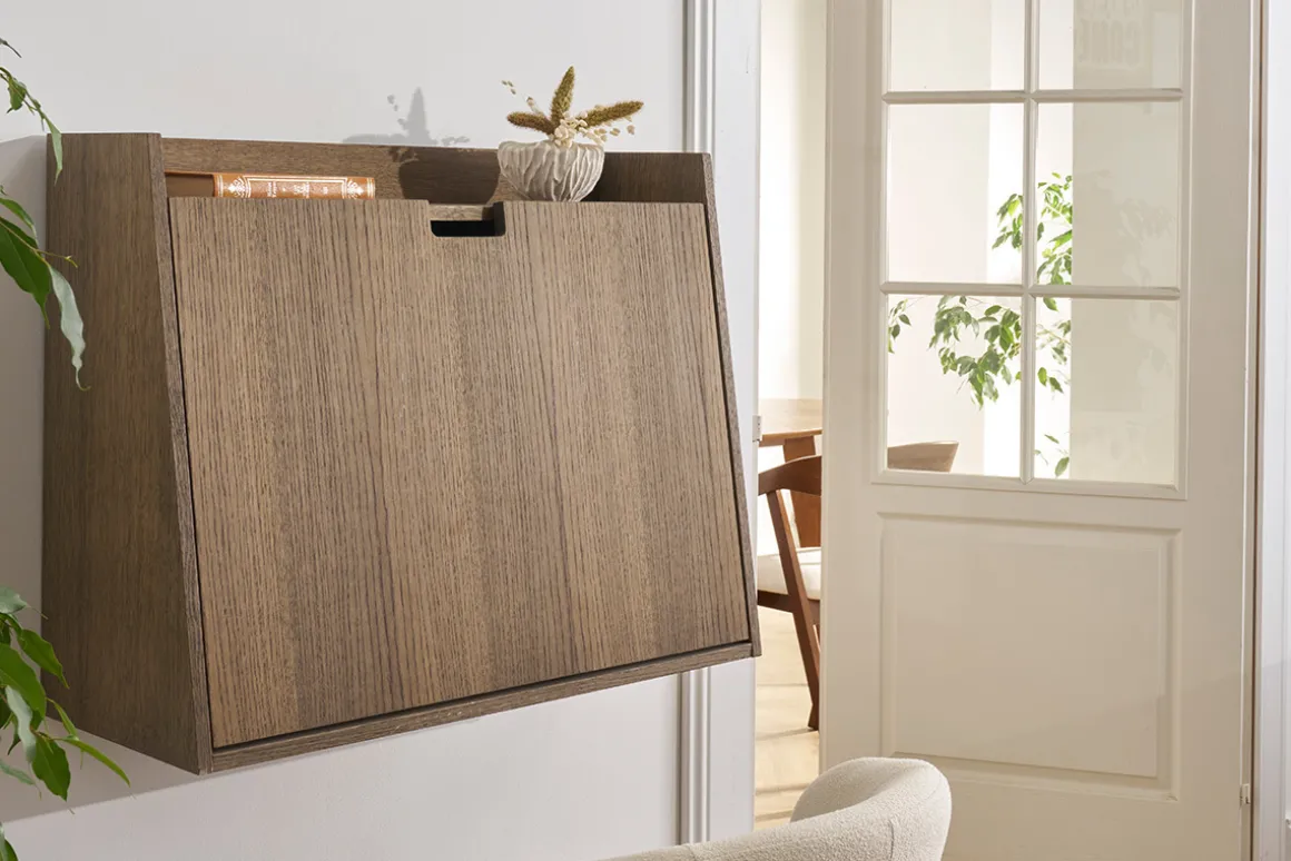 Télétravailler occasionnellement, rédiger un courrier ou ordonner des documents, ce bureau vintage suspendu sera LA solution pour aménager un bureau d’appoint ! Pour accéder au grand espace de rangement compartimenté en 6 niches, déployez le plateau abattant qui accueillera ponctuellement de faibles charges. Compact, avec ses dimensions fermées L78 x P19.5-30 x H60 cm, de faible profondeur et peu encombrant, ce meuble gain de place ne gênera pas à la circulation dans une pièce exiguë, une entrée, voire un couloir !