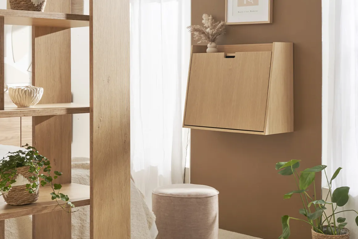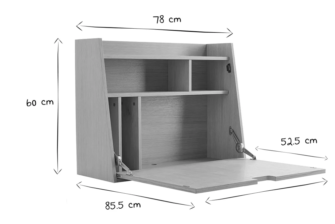 Télétravailler occasionnellement, rédiger un courrier ou ordonner des documents, ce bureau scandinave suspendu sera LA solution pour aménager un bureau d’appoint rabattable ! Pour accéder au grand espace de rangement compartimenté en 6 niches, déployez le plateau abattant qui accueillera ponctuellement de faibles charges. Compact, avec ses dimensions fermées L78 x P19.5-30 x H60 cm, de faible profondeur et peu encombrant, ce meuble gain de place ne gênera pas à la circulation dans une pièce exiguë, une entrée, voire un couloir !