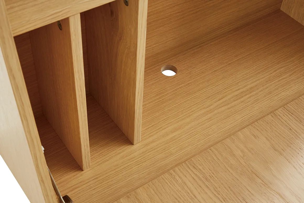 Très appréciable : le passe-câble intégré au soubassement permettra de rediriger avec discretion les fils électriques lorsque ordinateur portable, tablette et téléphone seront en charge. Livres, cadres, soliflores, lampe à poser… La tablette supérieure accueillera volontiers de la petite déco à votre image.