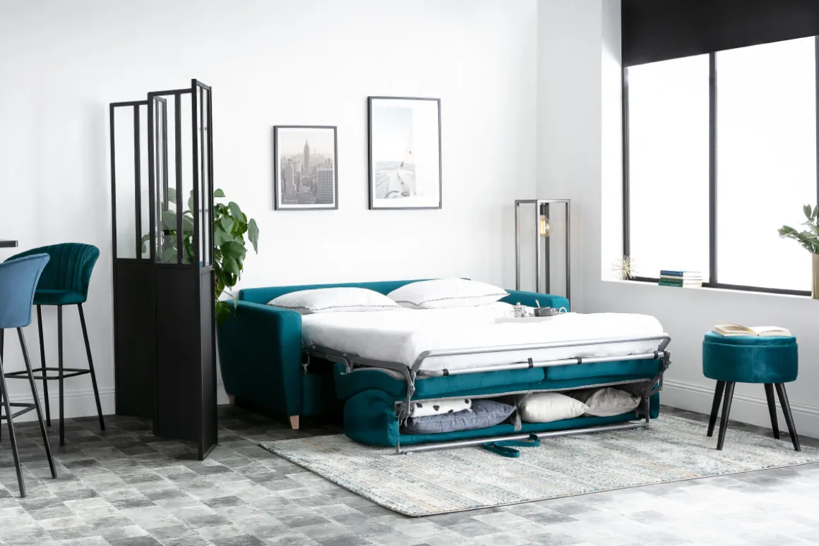 Grâce à son design soigné, ce canapé-lit est idéal pour s’aménager un coin nuit optimal sans faire une croix sur sa déco. Son assise renferme un sommier équipé d’un matelas 140 x 190 cm afin de pouvoir dormir à deux confortablement. Combinaison parfaite entre un canapé design et un véritable lit, le canapé convertible GRAHAM conviendra parfaitement pour faire dormir ses convives. Ses deux espaces de rangement dissimulés dans le dossier en font l’allier des petits appartements.