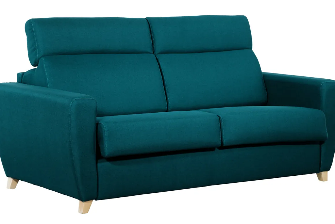 Ce canapé 3 places est revêtu d’un tissu polyester bleu paon élégant et équipé d’un piètement authentique en hêtre massif. L’association de ces matériaux rappelle ce qui fait le succès des canapés scandinaves tout en apportant un charme certain à cette assise. On aime particulièrement ses têtières ajustables pour le confort et son design épuré qui lui donne ce style indémodable. Le canapé GOYA renferme tout ce qu’on attend d’un canapé confortable : une assise agréable et des têtières réglables pour ajuster le confort de chacun.