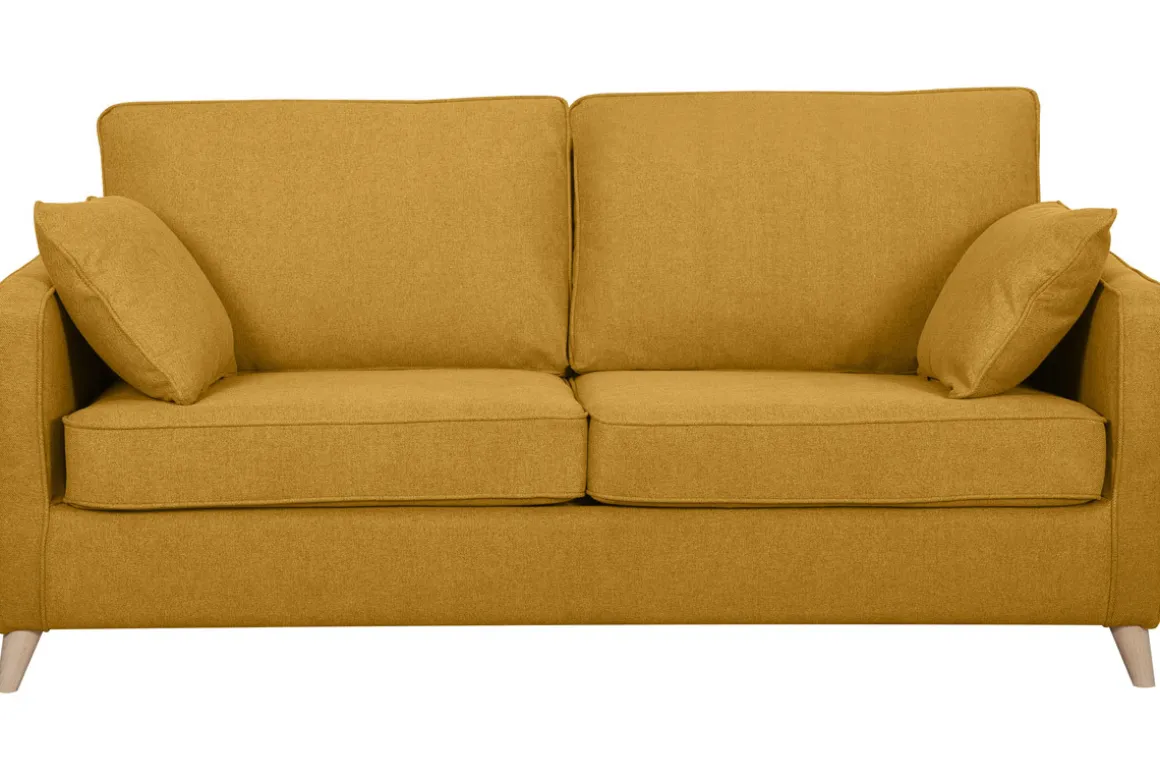 Miliboo Canapé Convertible|Voir Tous Les Canapés-Canapé convertible scandinave 3 places en tissu jaune cumin et bois clair avec matelas 10 cm PAPEL