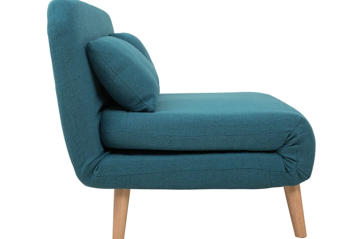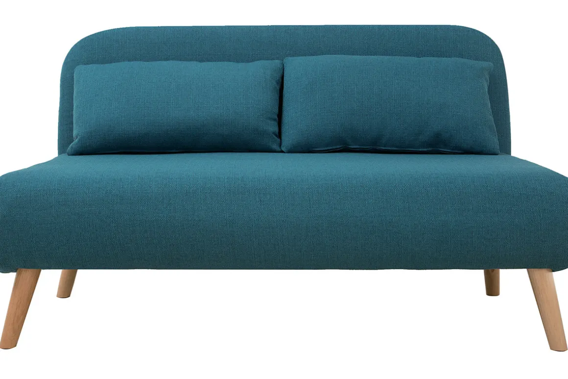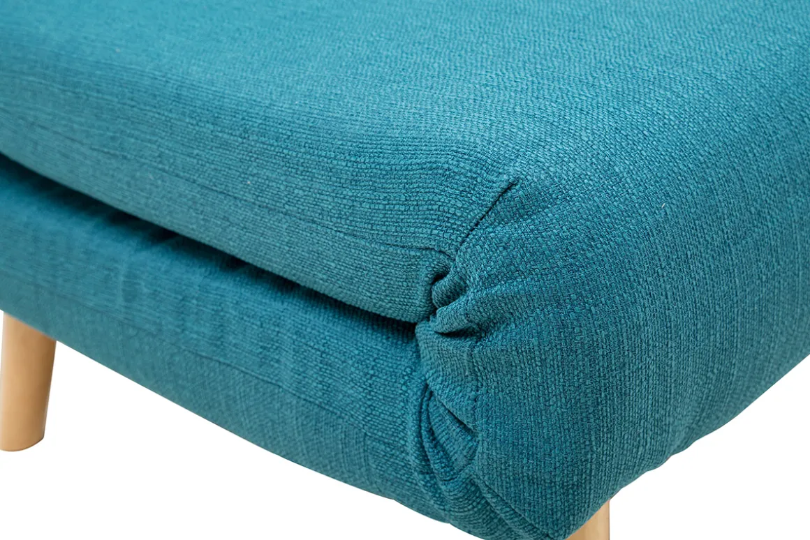Cette banquette-lit en polyester bleu canard s’adapte à tout type d’intérieur. Avec son design simple et épuré, elle convient parfaitement à des pièces à la décoration moderne ou encore scandinave. Son piétement évasé en hévéa apporte un charme unique à ce petit canapé.