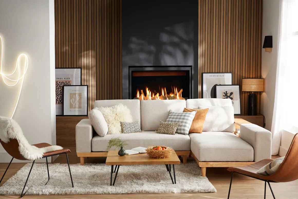 En plus de mettre en valeur votre nouveau canapé, un tapis écru et une suspension en lin contribueront grandement à la création d’un univers doux et réconfortant.