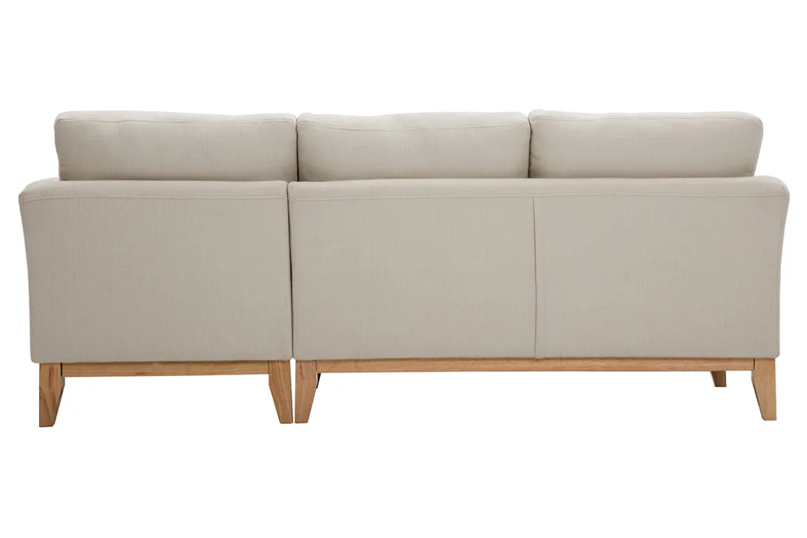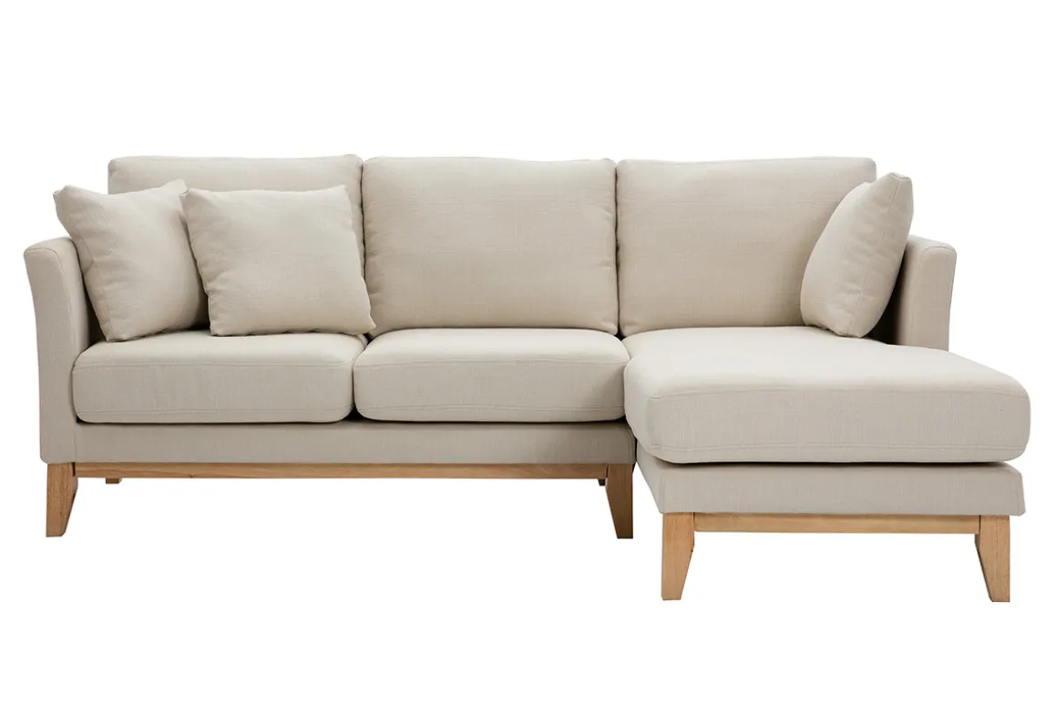 Canapé d’angle droit déhoussable scandinave en tissu beige et bois clair 4 places OSLO livré prêt à assembler. Montage simple, seuls les pieds sont à fixer. Les colis étant volumineux, nous vous conseillons de vérifier que portes et escaliers permettent leur passage.