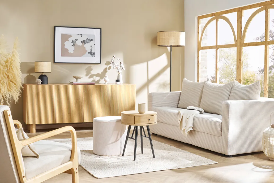 Côté association, accompagnez ce canapé beige de pièces de mobilier aux tonalités claires comme une table basse en chêne ou un pouf en tissu bouclette blanc pour créer un cocon chaleureux et apaisant !