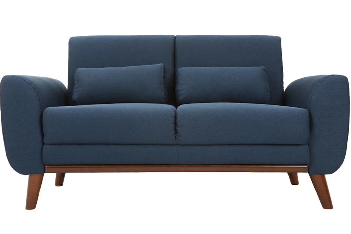 Ce canapé 2 places est inimitable. Son tissu coloré et ses formes tout en rondeurs en font un endroit où il fait bon se lover. Ses pieds en hévéa teintés noyer apportent de la chaleur à l’ensemble et donnent un esprit vintage à l’ensemble.