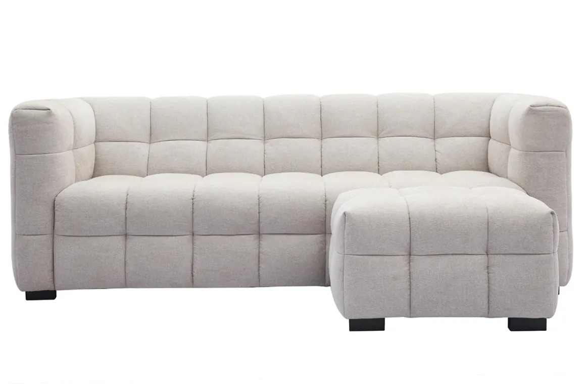 Parce que les instants de paix ou moments conviviaux sont encore plus appréciés lorsque l’on est bien installé, le duo CORTO ne laisse rien au hasard côté confort ! À la fois chic et cosy, parfait pour profiter d’instants cocooning, ce set – composé d’un grand canapé moderne 3 places (dimensions L210 x P88 x H73.5 cm) et d’un petit pouf repose-pieds (dimensions L70 x P55 x H43 cm) – se distingue par des formes nébuleuses et un gonflant enveloppant.
