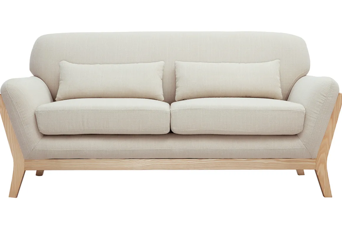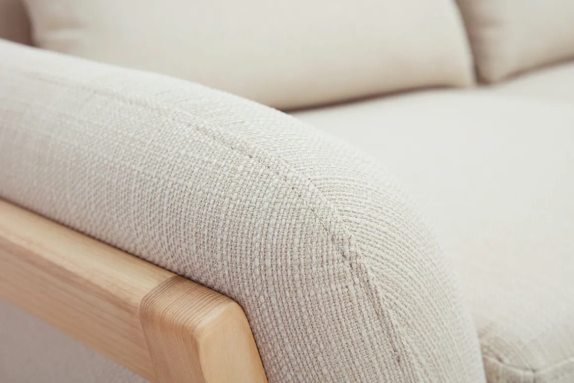 Le mariage entre une assise généreuse, habillée d’une trame 100% polyester – aussi agréable à l’oeil qu’au toucher – et une structure apparente en bois massif (frêne massif), fait tout le charme de ce canapé en tissu beige et bois clair.