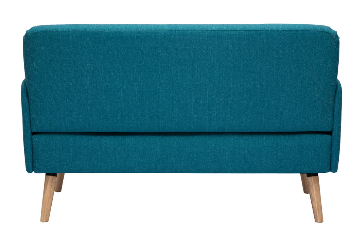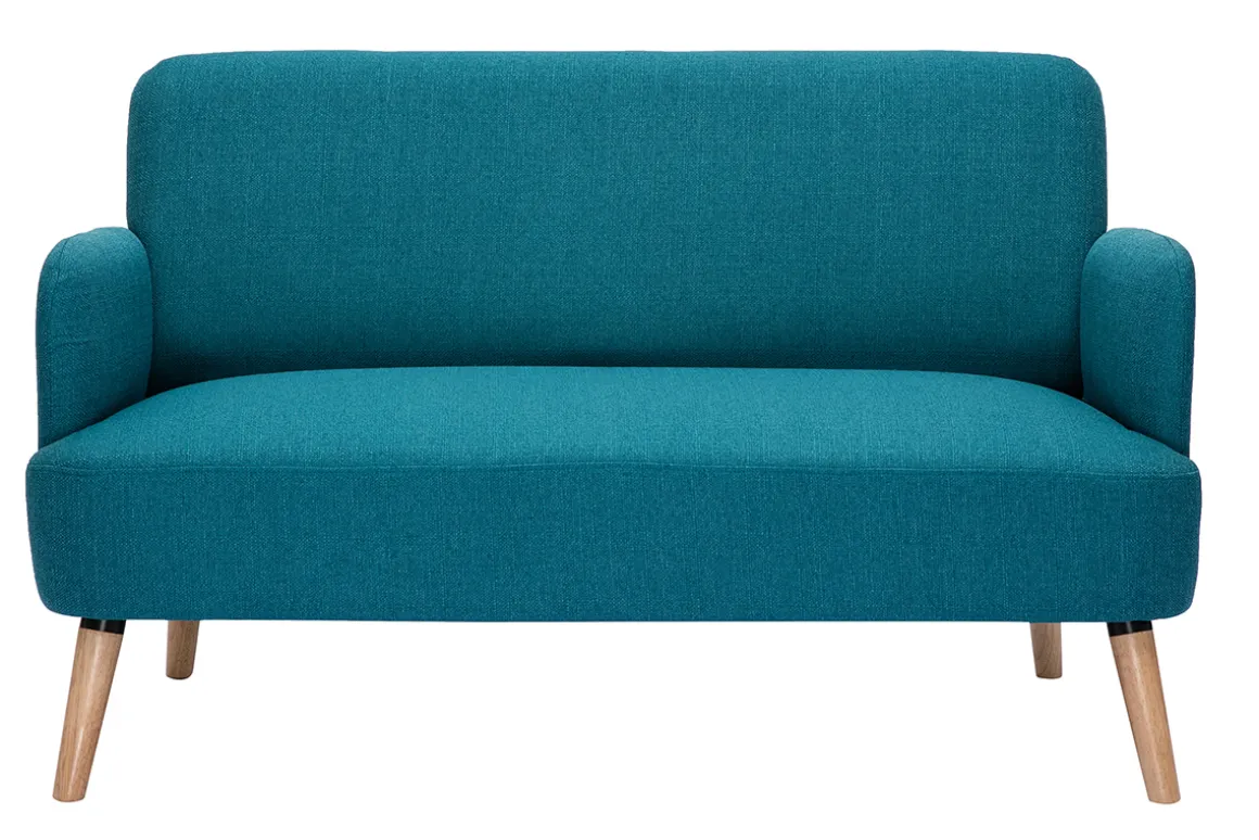 Canapé en tissu bleu canard et bois clair livré prêt à monter.