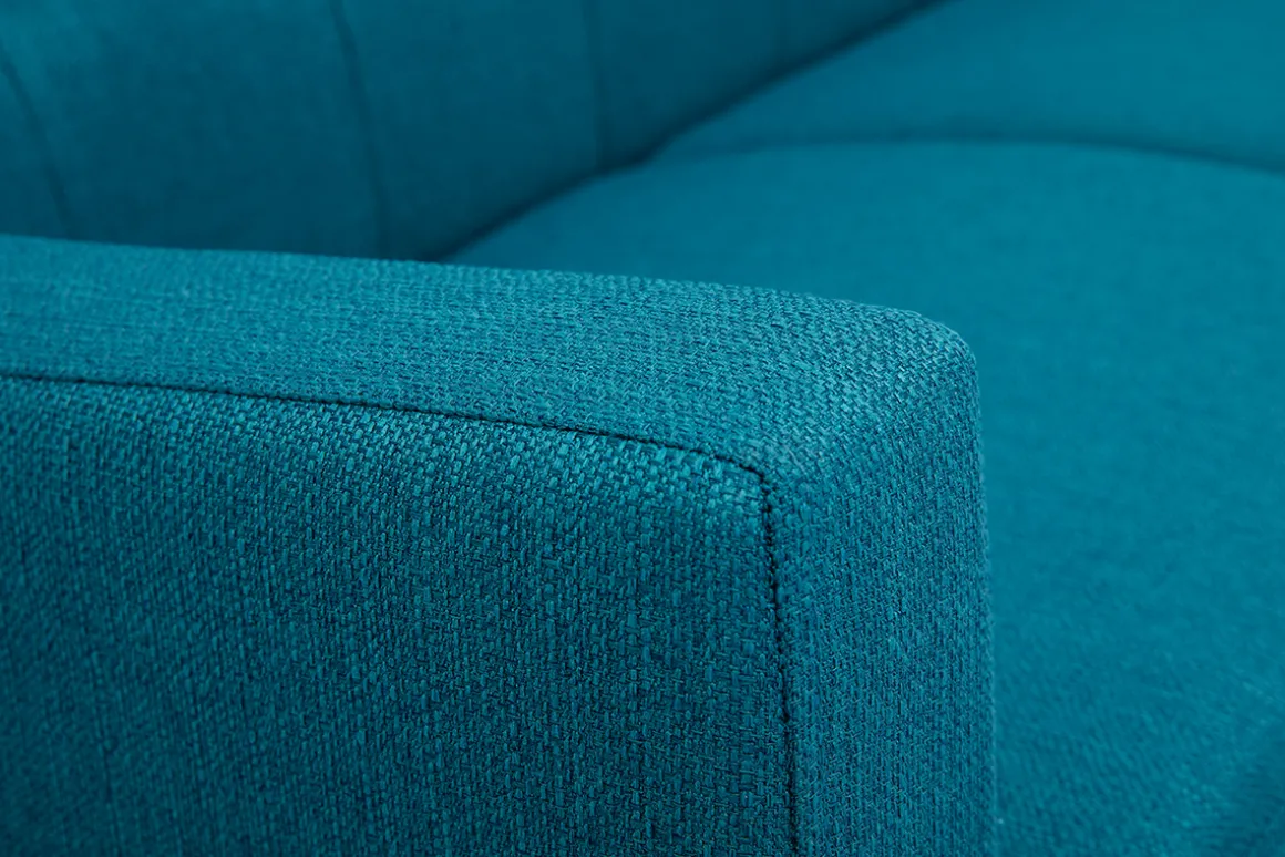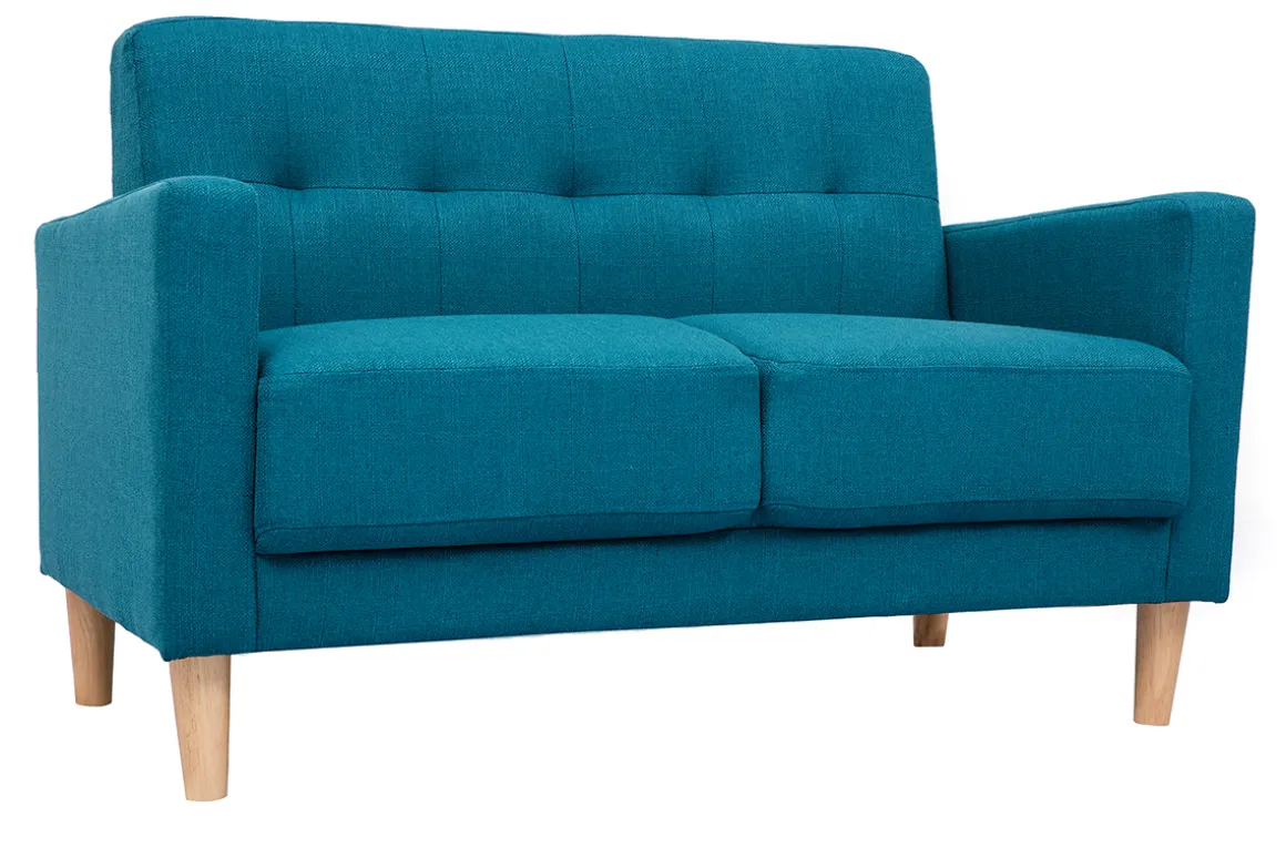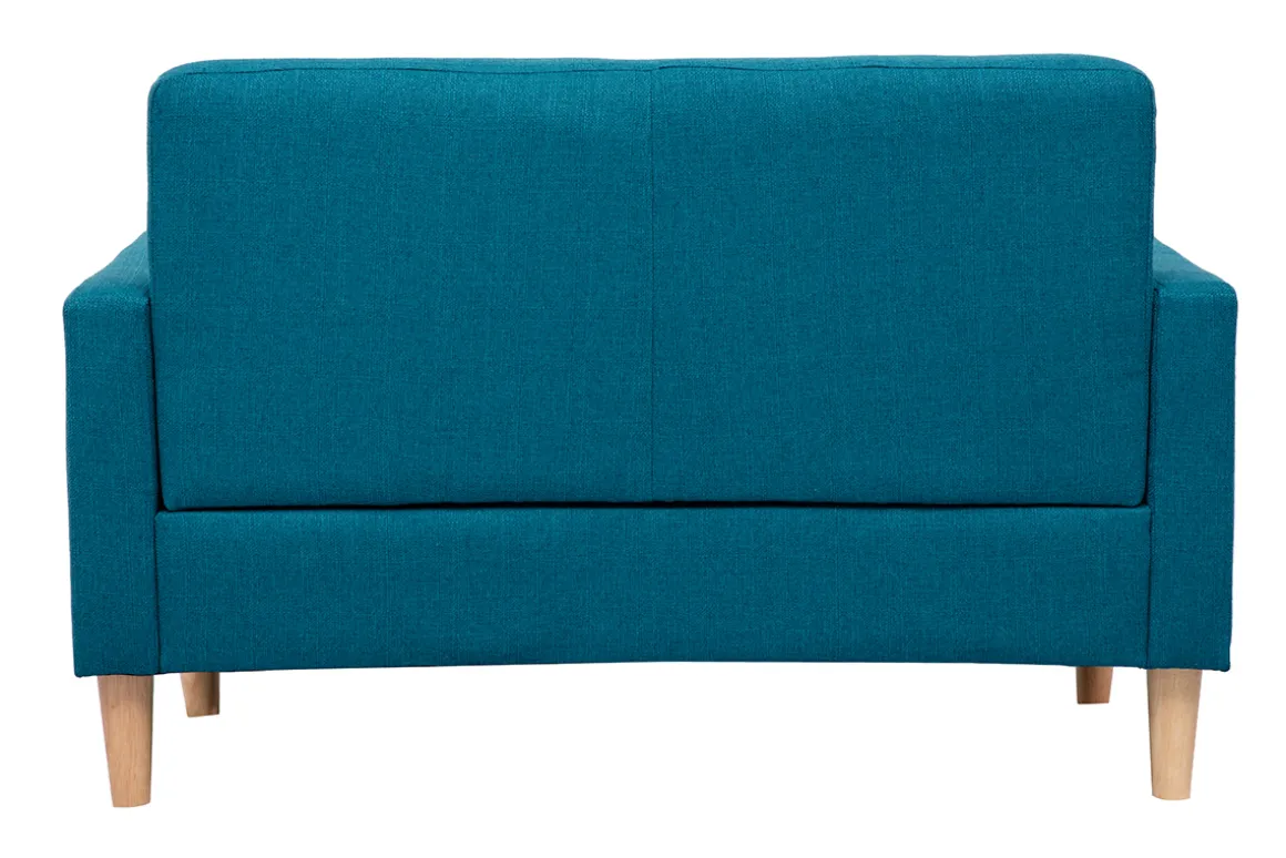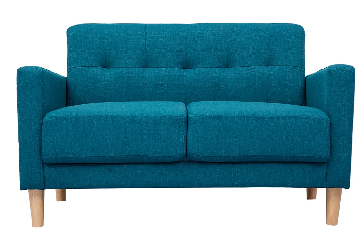 Avec son assise pour deux personnes en tissu bleu canard, il apporte une touche chaleureuse et une teinte tendance à votre intérieur. Ce canapé joue sur un subtil jeu de formes et un dossier capitonné qui convient parfaitement à un salon classique ou plus moderne.