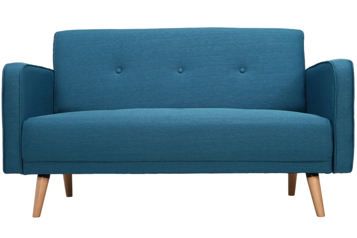 Avec son petit gabarit (dimensions L136 x P82 x H82 cm), ce véritable canapé 2 places en tissu bleu canard et bois clair est idéal pour un studio ou un petit appartement.