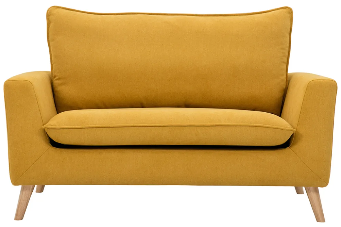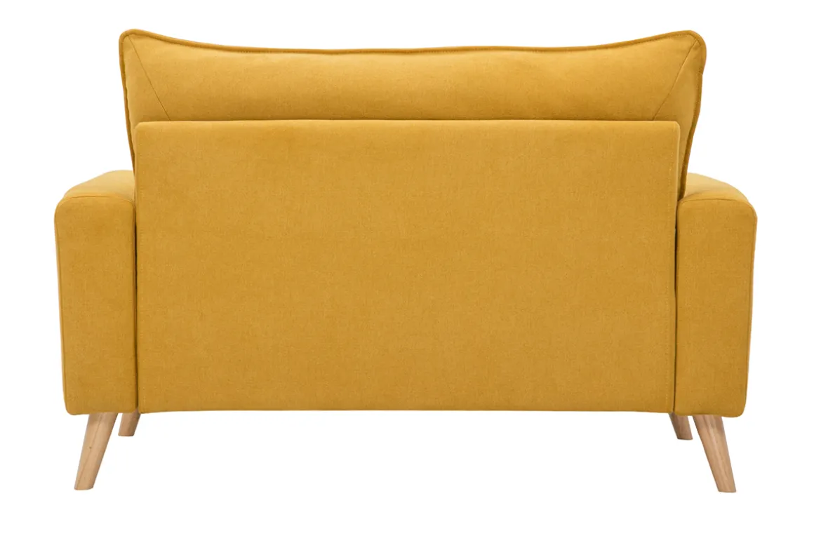 Canapé scandinave 2 places en tissu effet velours jaune moutarde et bois clair JONAS livré prêt à assembler.